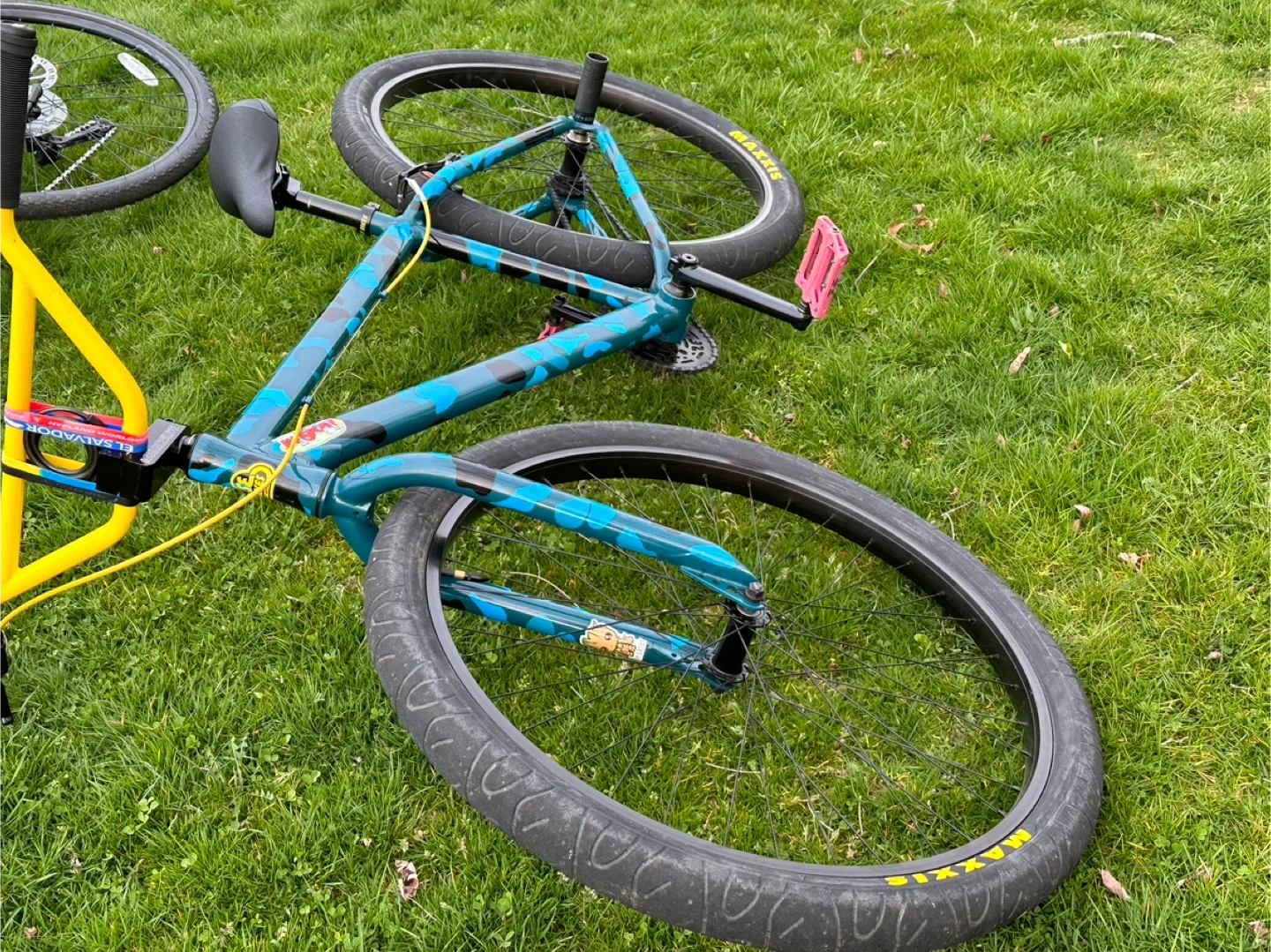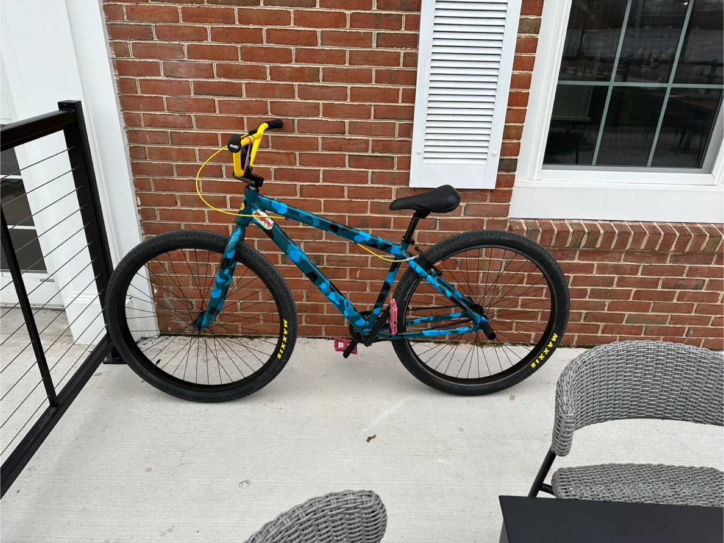 This SE Bikes big flyer is a 29" BMX bike in a cool blue camouflage pattern. It features yellow handlebars and pink pedals. The tires are Maxxis brand. This bike is built for performance and style!