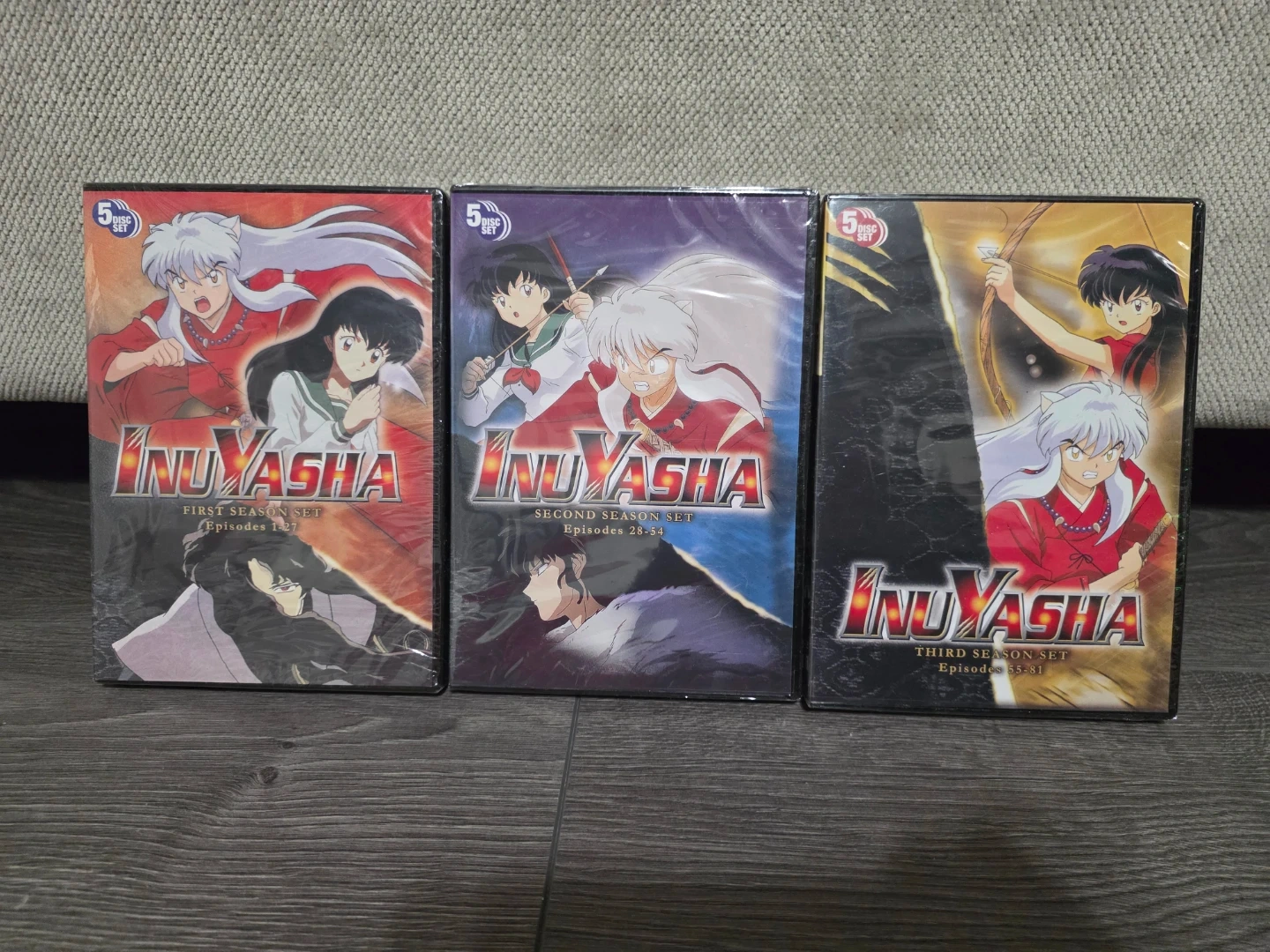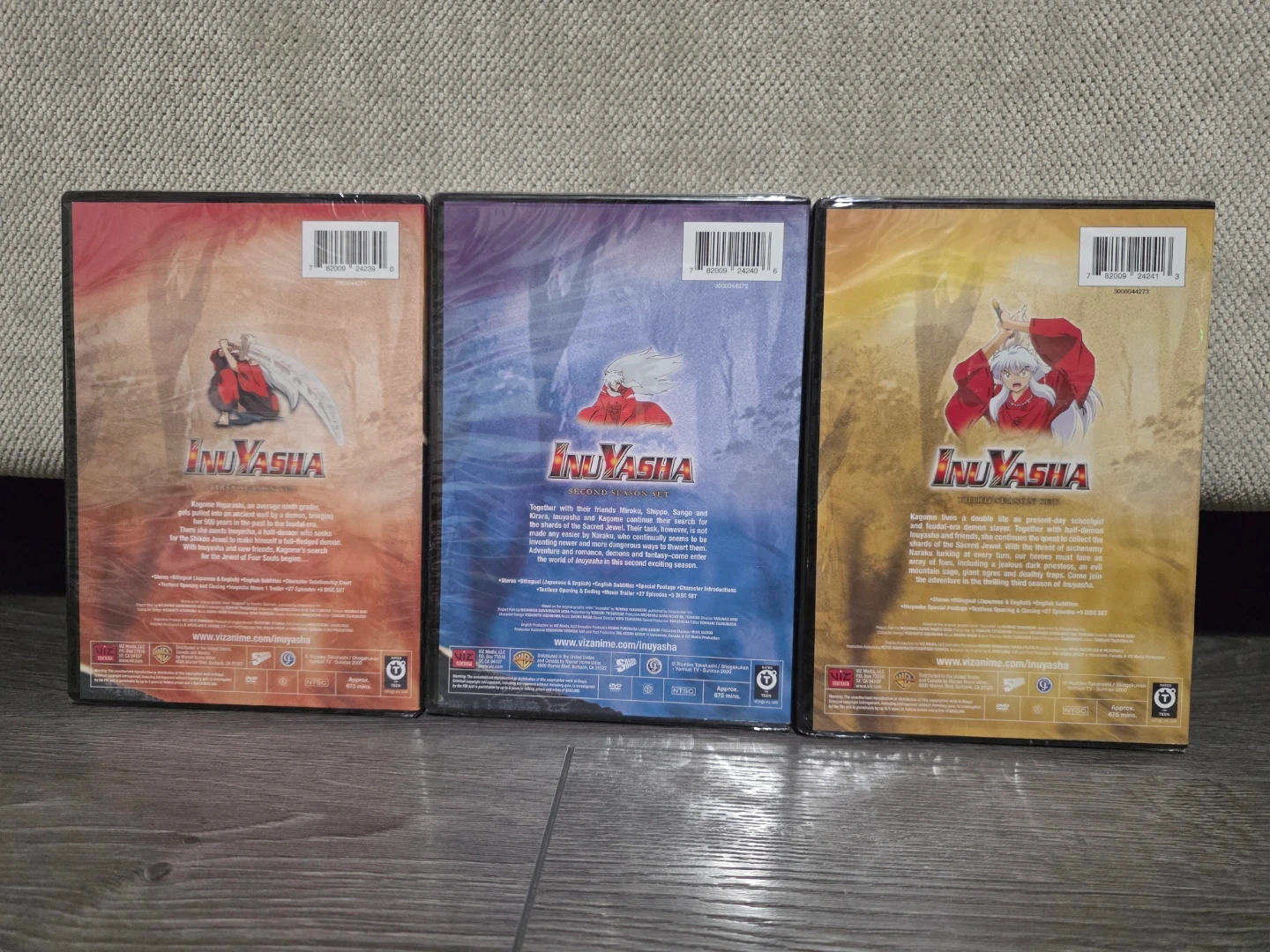 This is a collection of the first three season DVD sets for the anime InuYasha. Each set contains 5 discs. The series follows a modern-day schoolgirl transported to feudal Japan. All brand new, still in their shrink wrap.