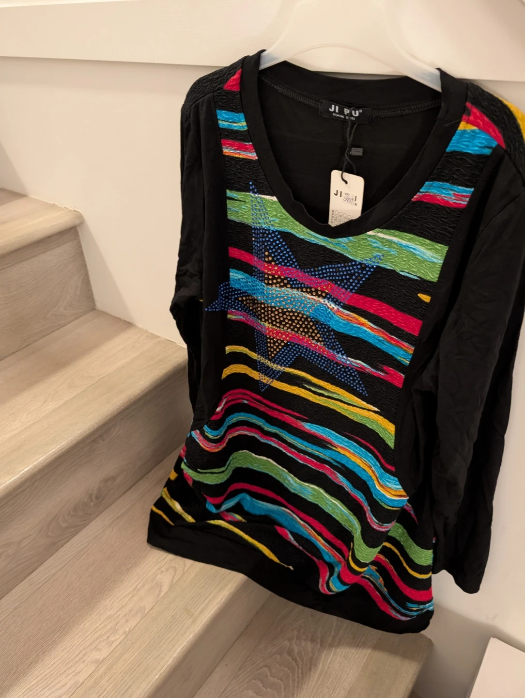 1. Long sleeve top features a vibrant, colourful star design on the front, accented with horizontal striped patterns in the front & back. It's made from a comfortable material and offers a unique, eye-catching look. Perfect for adding a pop of colour to your casual outfits! Size L $5