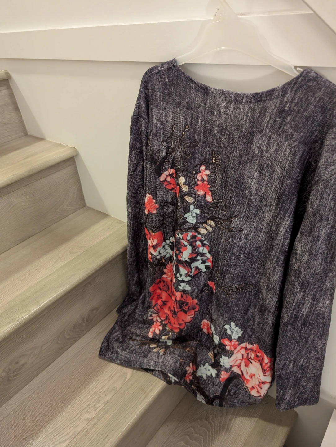 2. Grey long sleeve w/orangey flowers in the front & back - Size L $5