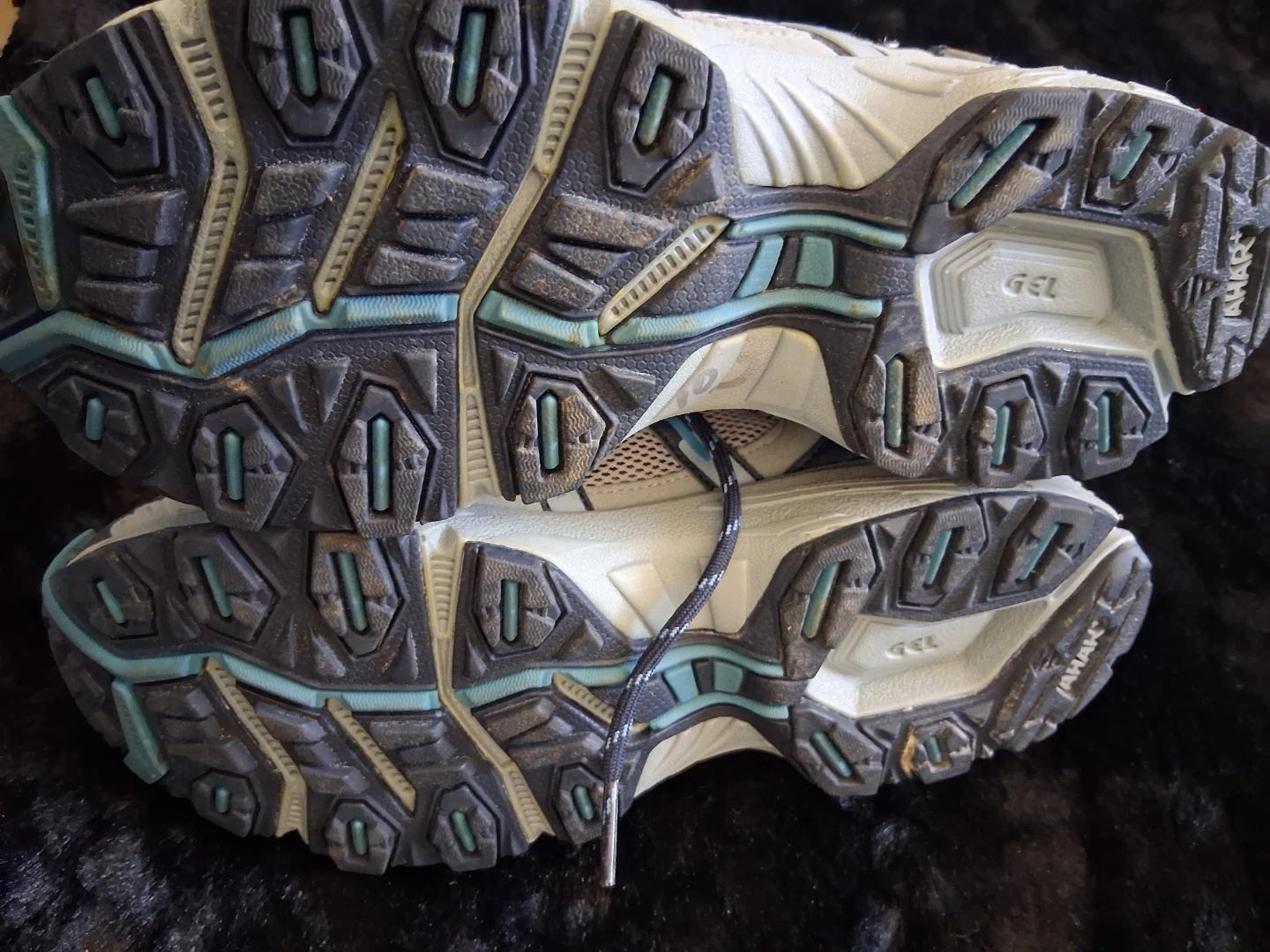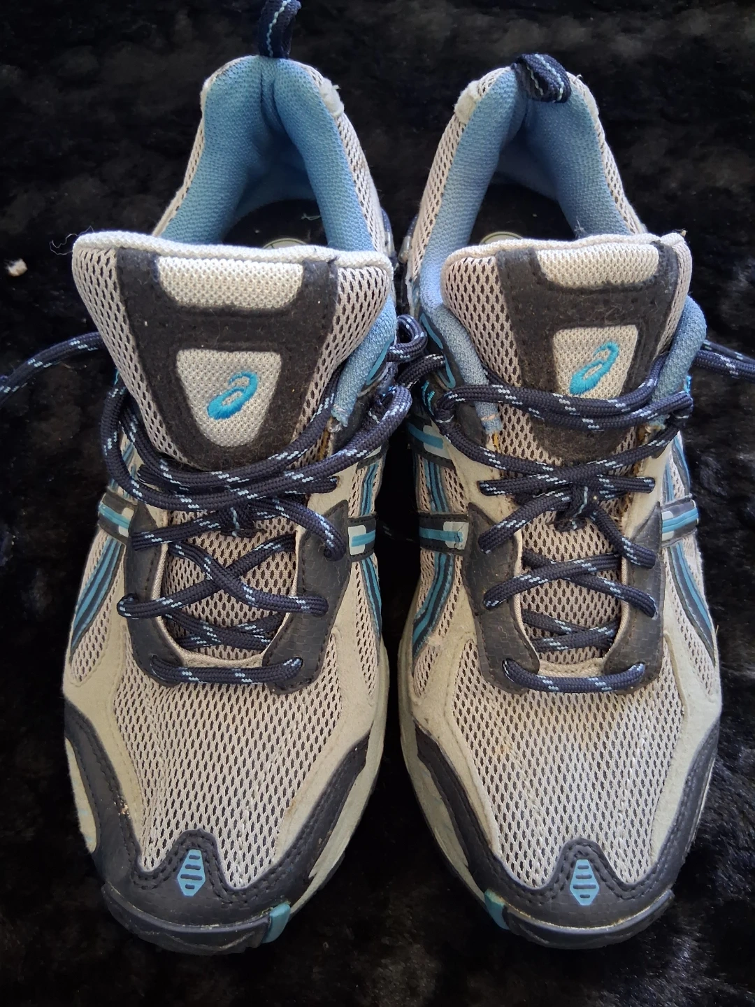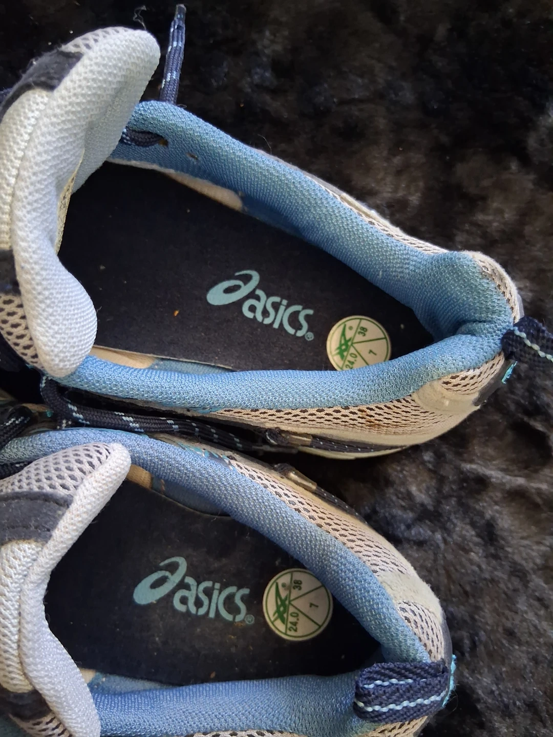 These are ASICS women's running shoes. They're a size 7. They have a mesh upper and GEL cushioning in the sole.