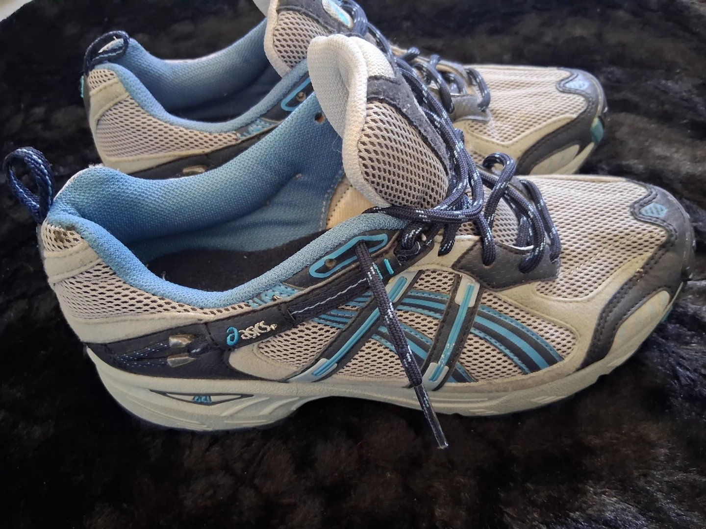 These are ASICS women's running shoes. They're a size 7. They have a mesh upper and GEL cushioning in the sole.