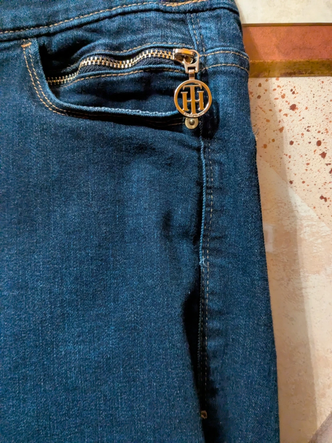 Sleek dark blue Tommy Hilfiger jeggings with a slim, tapered leg. Soft stretch denim for comfortable movement. Subtle pocket details with a branded charm accent. Versatile style that pairs easily with tops and jackets.