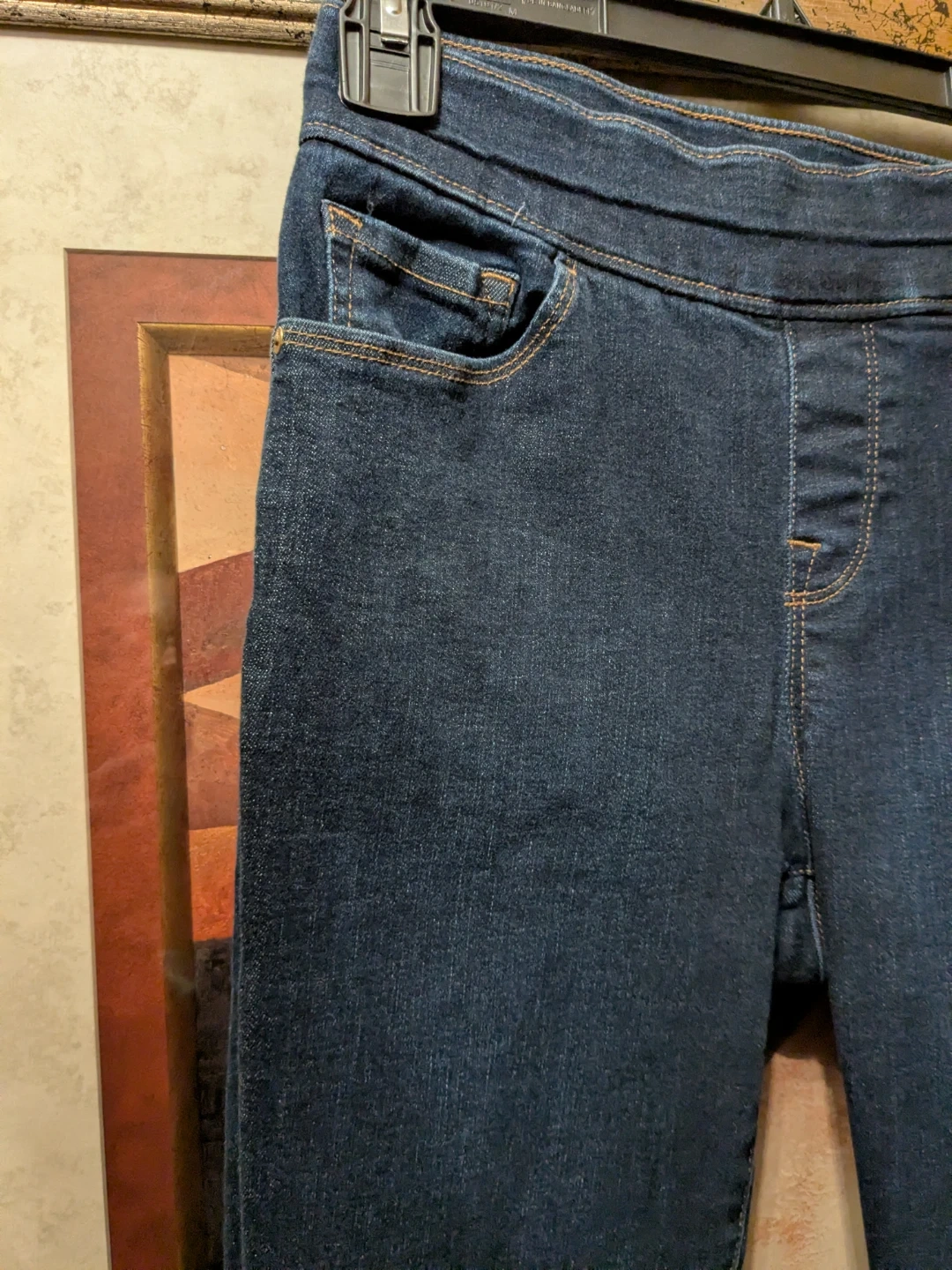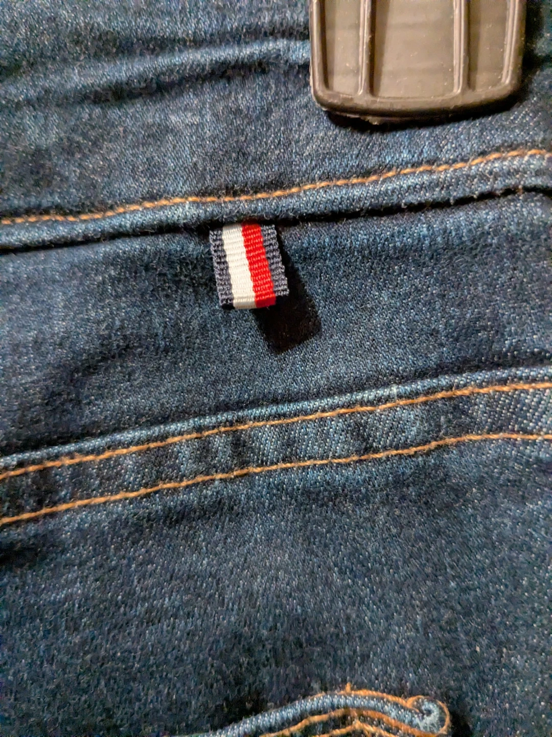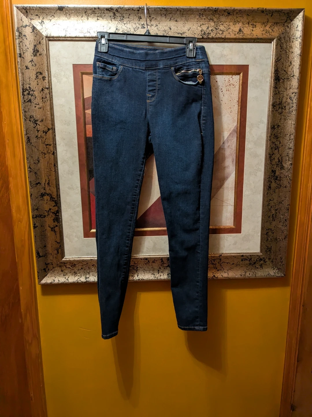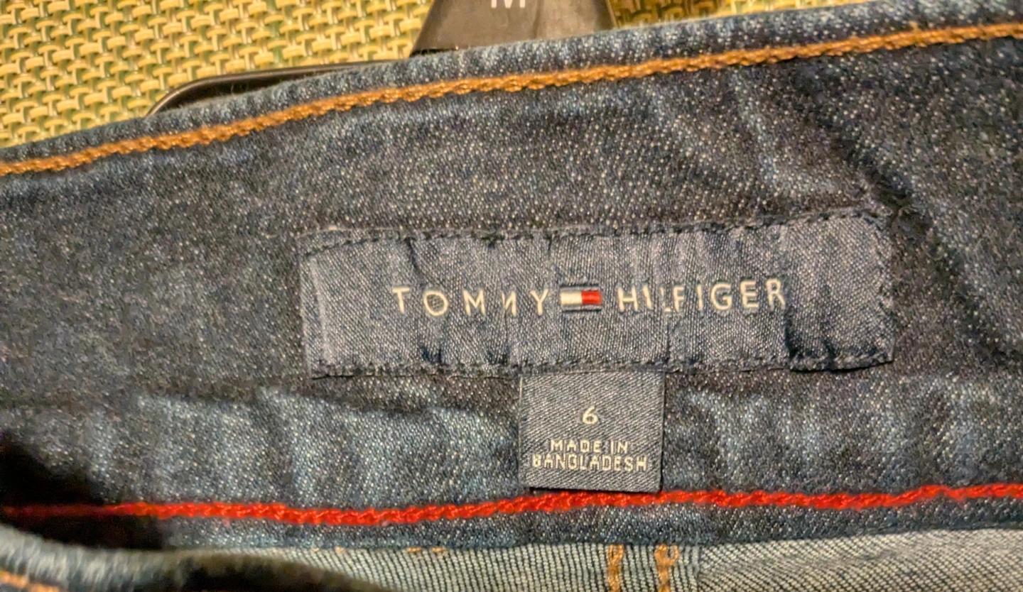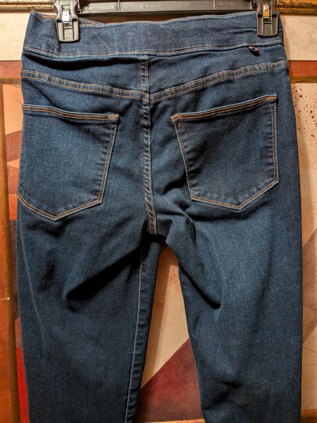Sleek dark blue Tommy Hilfiger jeggings with a slim, tapered leg. Soft stretch denim for comfortable movement. Subtle pocket details with a branded charm accent. Versatile style that pairs easily with tops and jackets.