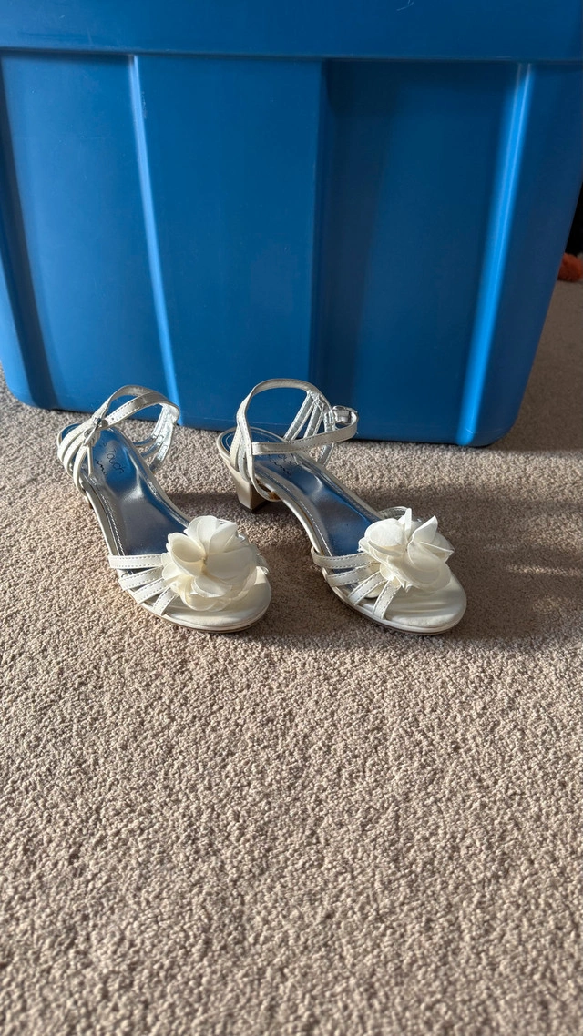 A beautiful pair of white wedge sandals, perfect for a special occasion like a wedding, party, or prom. They feature a low wedge heel for comfort and an elegant floral applique on the front strap. The sandals have an adjustable ankle strap for a secure fit. Details: Color: White Size: 3 Brand: The Touch Condition: Gently Used Price: $10