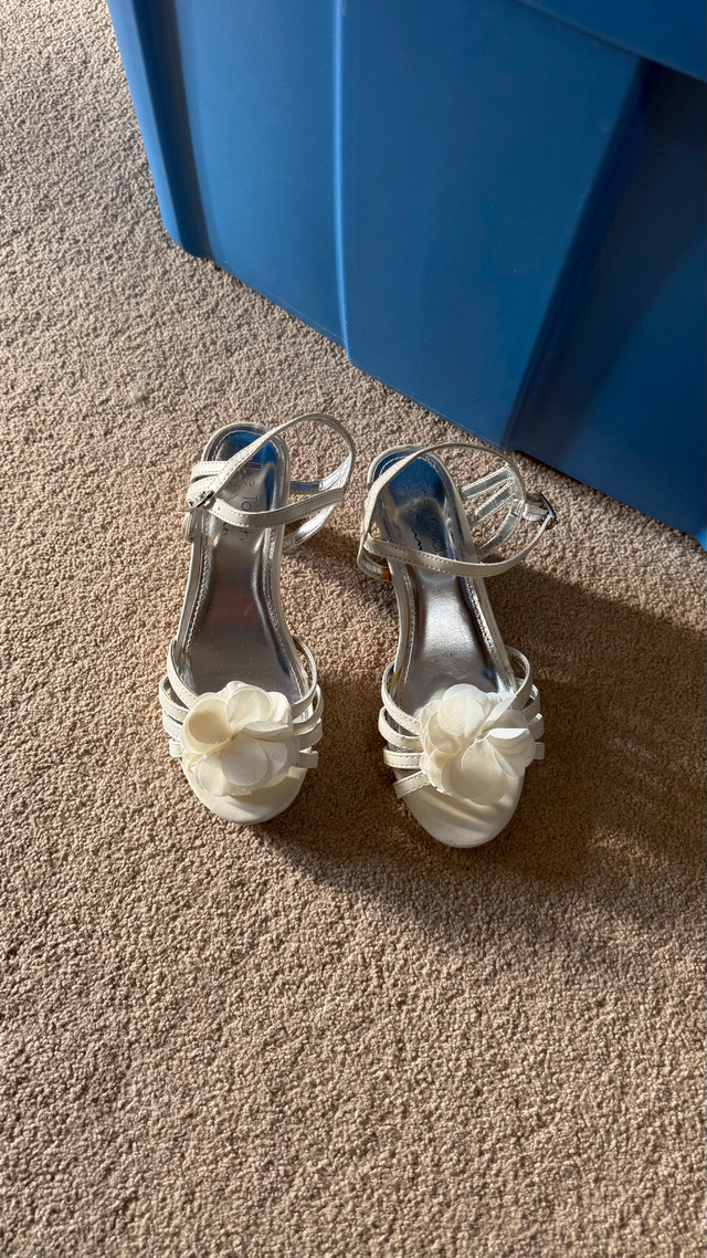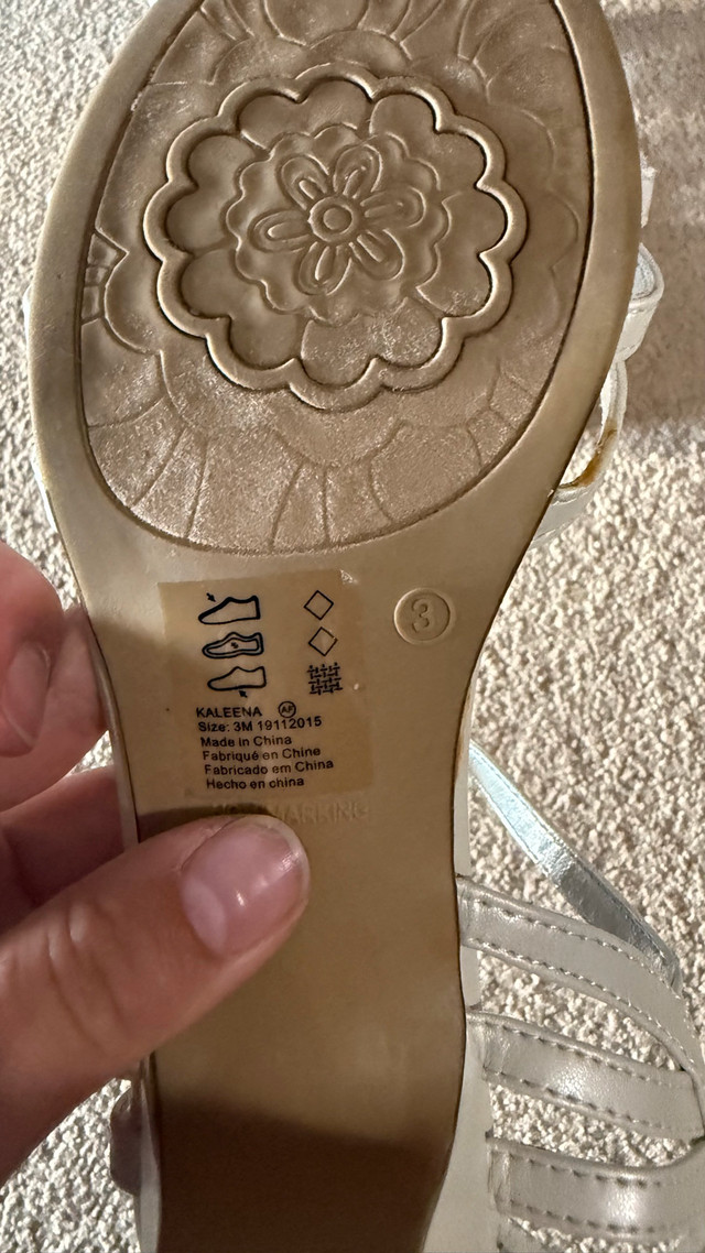 A beautiful pair of white wedge sandals, perfect for a special occasion like a wedding, party, or prom. They feature a low wedge heel for comfort and an elegant floral applique on the front strap. The sandals have an adjustable ankle strap for a secure fit. Details: Color: White Size: 3 Brand: The Touch Condition: Gently Used Price: $10