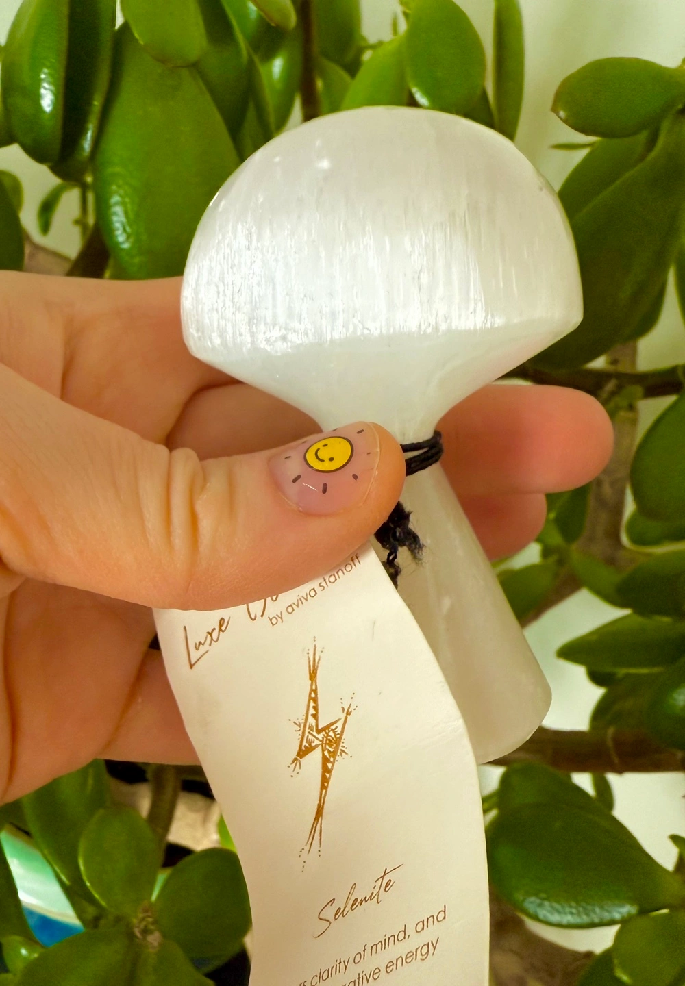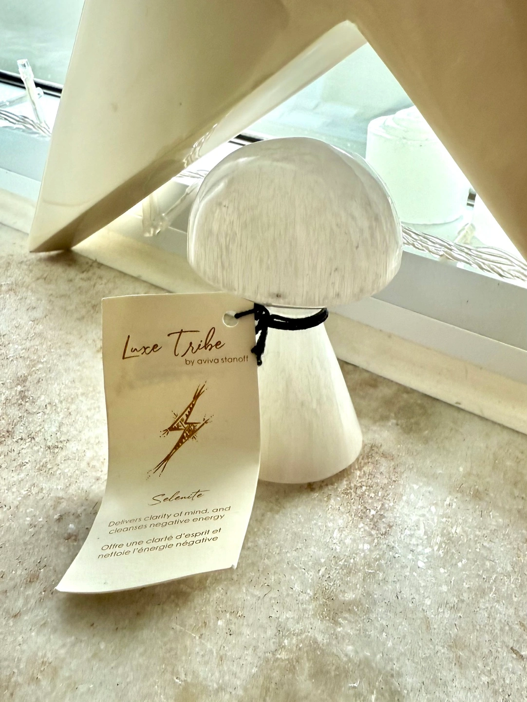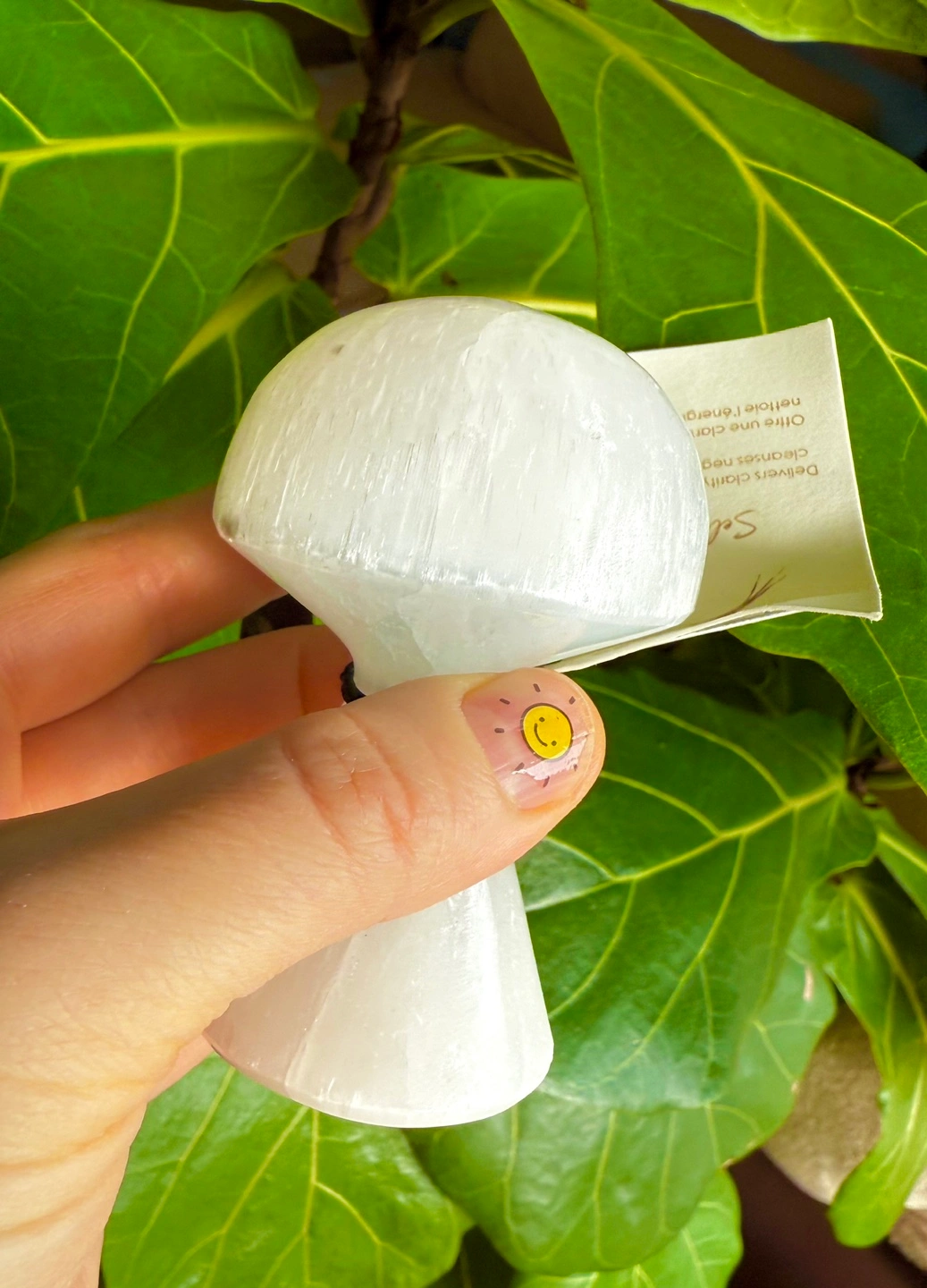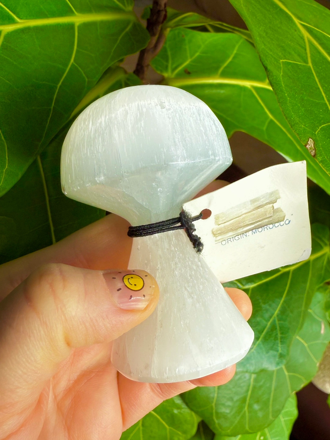 Moroccan selenite mushroom, hand carved. New with tags. Approximately 3.5” high.