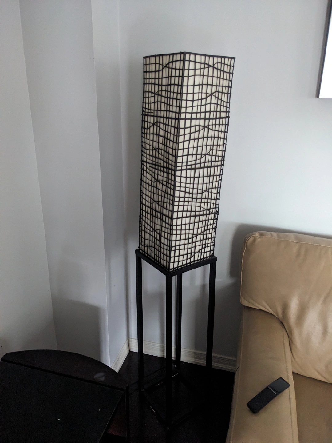 Looking to brighten up your space? This modern floor lamp features a sleek black frame and a stylish woven shade. It's in great condition and ready to add a touch of elegance to any room!