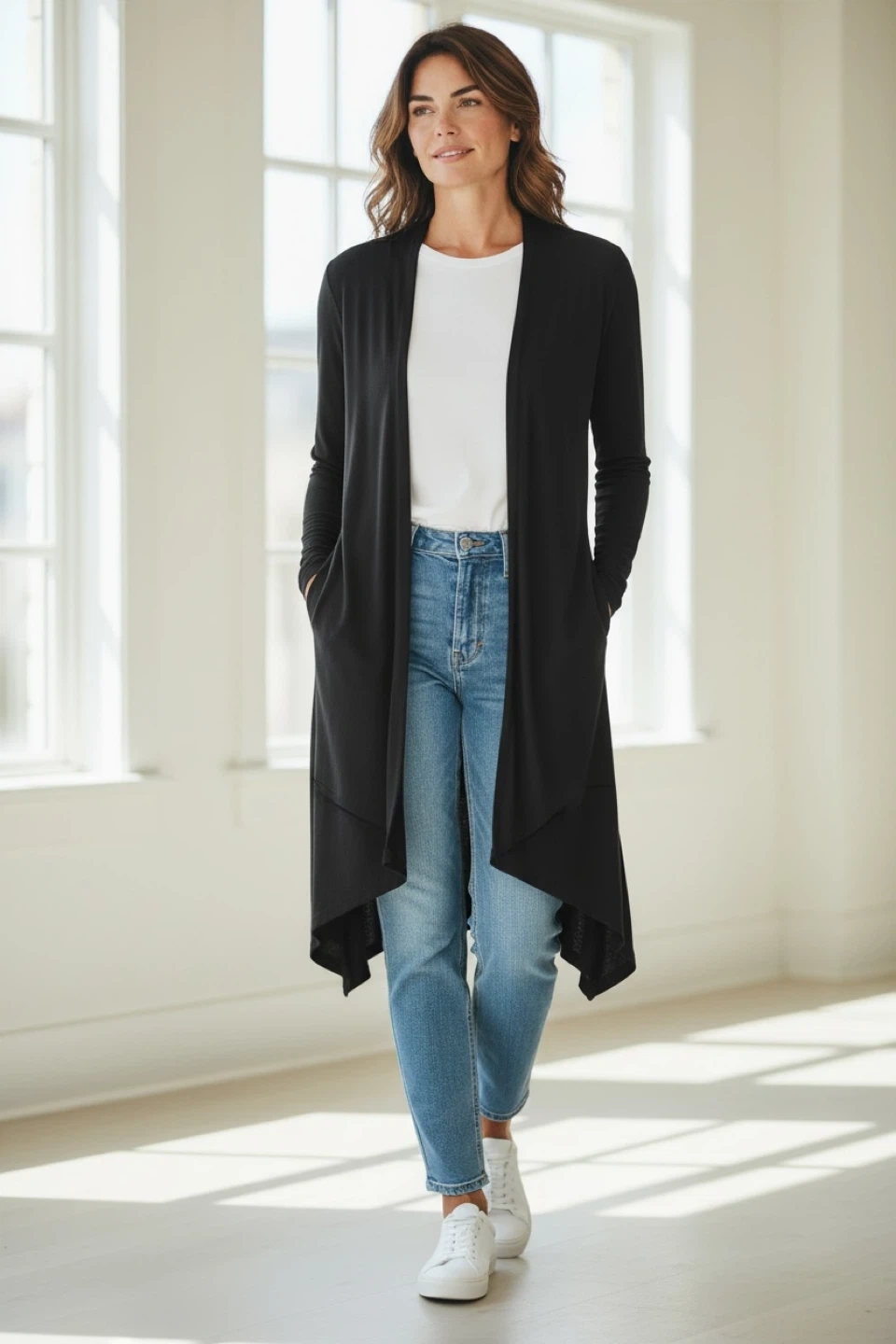 This is a long black cardigan with an open front design. It has long sleeves and two front pockets. The material appears to be a soft knit. It's a versatile layering piece.