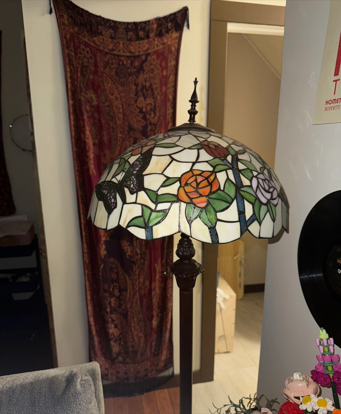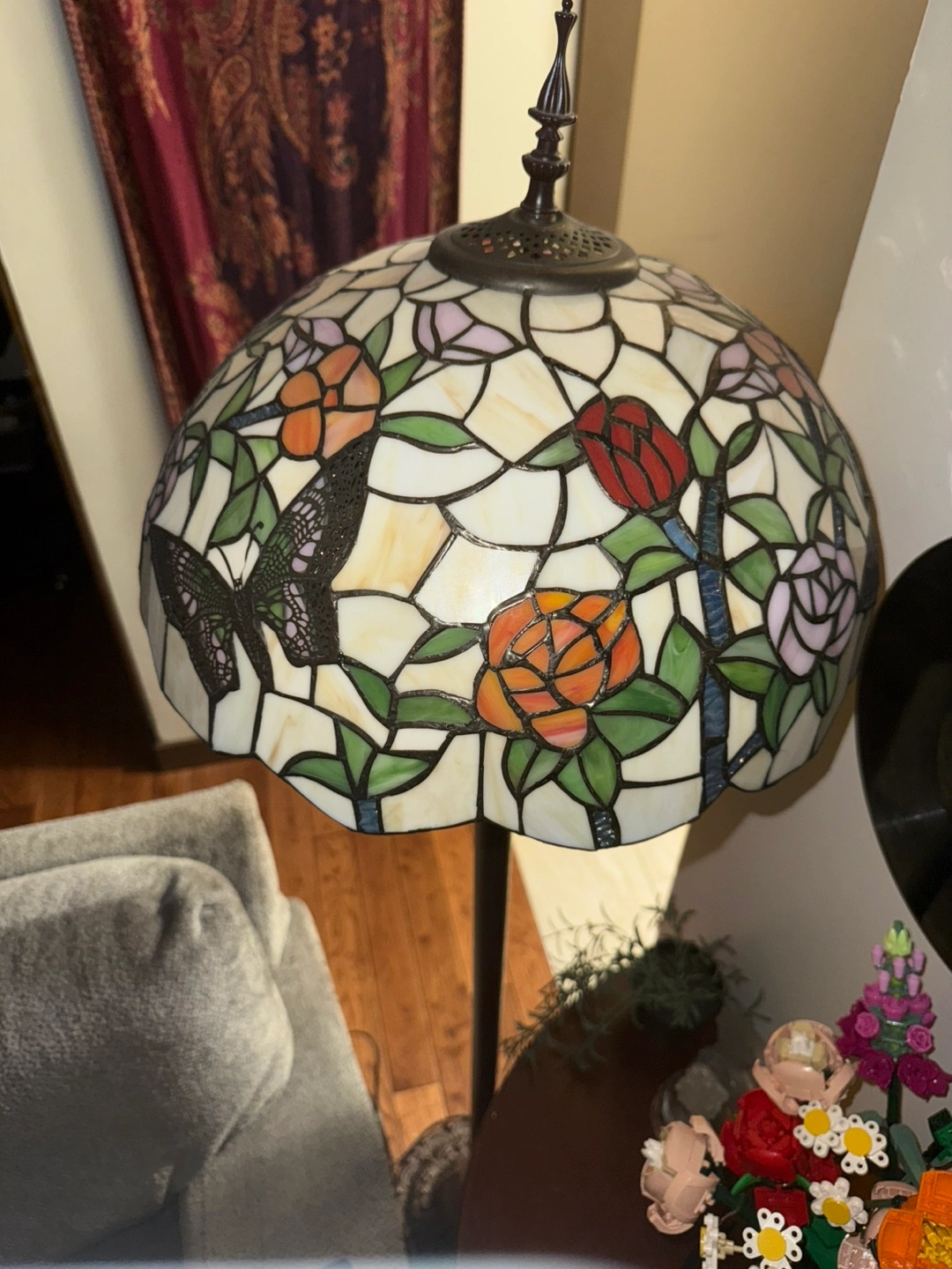 Beautiful Tiffany style floor lamp with a stained glass shade featuring a butterfly and floral design. It's in great condition and would add a touch of elegance to any room. *Wiring Issue* I believe some wires gave out. Probably an easy fix I’m just not skilled in that area.!! Send an offer