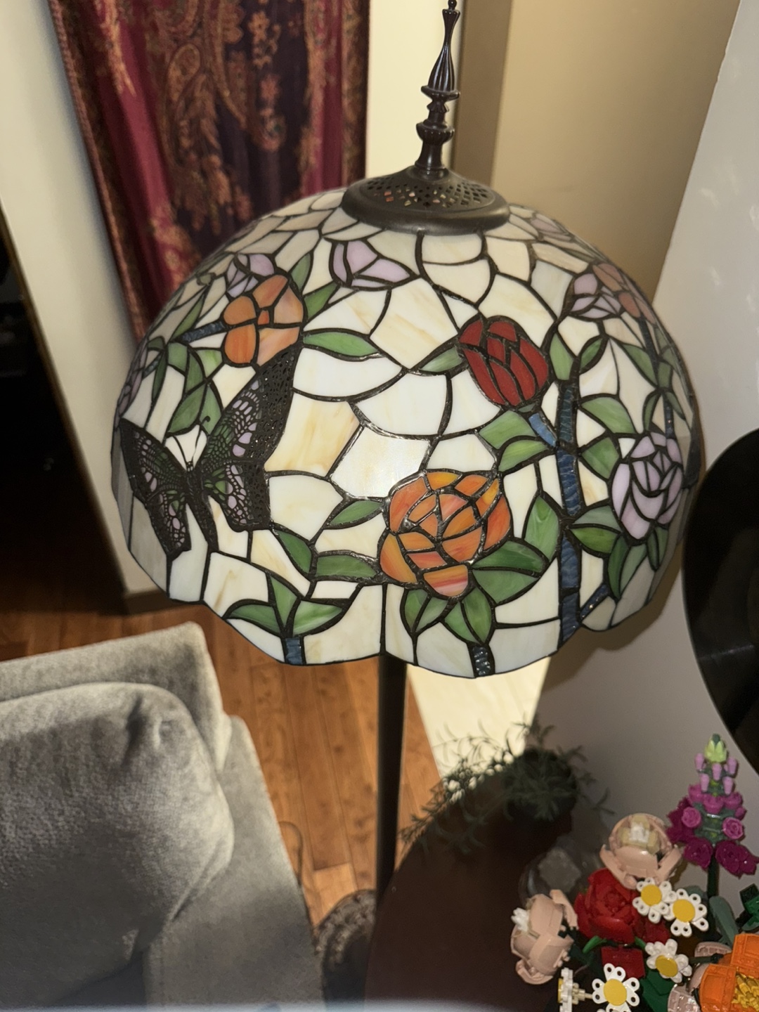 Beautiful Tiffany style floor lamp with a stained glass shade featuring a butterfly and floral design. It's in great condition and would add a touch of elegance to any room. *Wiring Issue* I believe some wires gave out. Probably an easy fix I’m just not skilled in that area.!! Send an offer