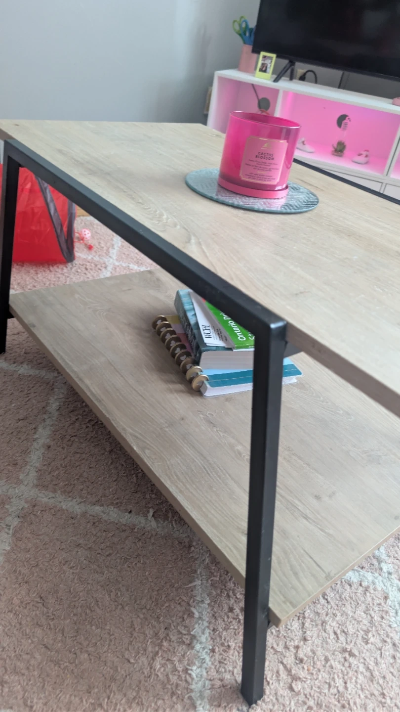 This coffee table features a light wood grain laminate top and shelf with a black metal frame. It's spacious enough for your living room essentials. The shelf offers extra storage for books or decor.