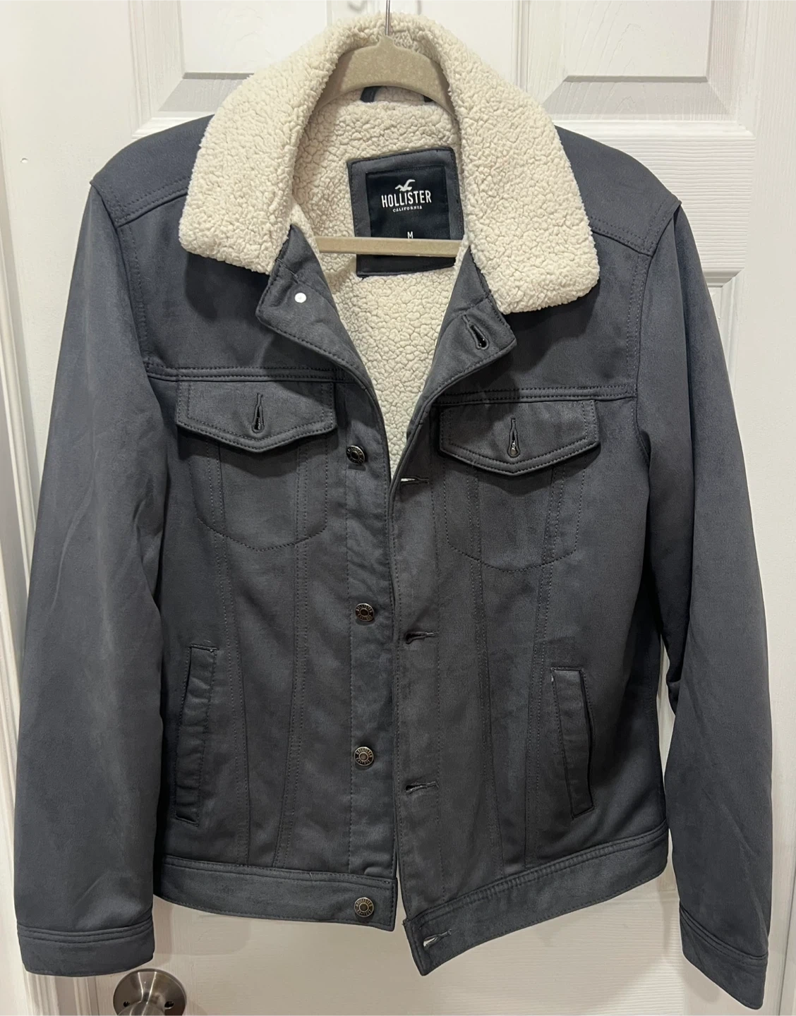 Grey sherpa-lined trucker jacket from Hollister. It's a size medium with a faux suede exterior and cozy sherpa lining and collar. This jacket is perfect for cooler weather!