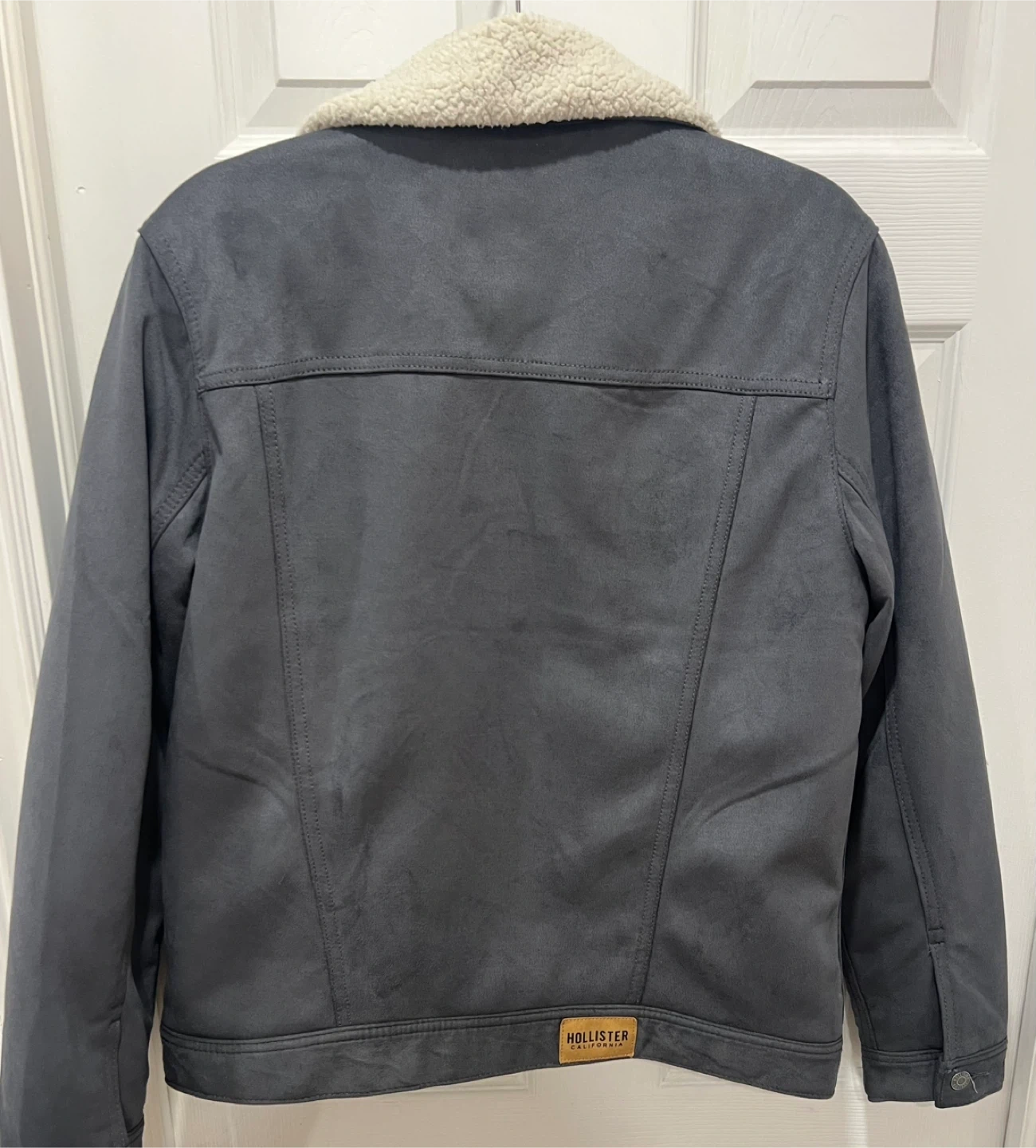 Grey sherpa-lined trucker jacket from Hollister. It's a size medium with a faux suede exterior and cozy sherpa lining and collar. This jacket is perfect for cooler weather!