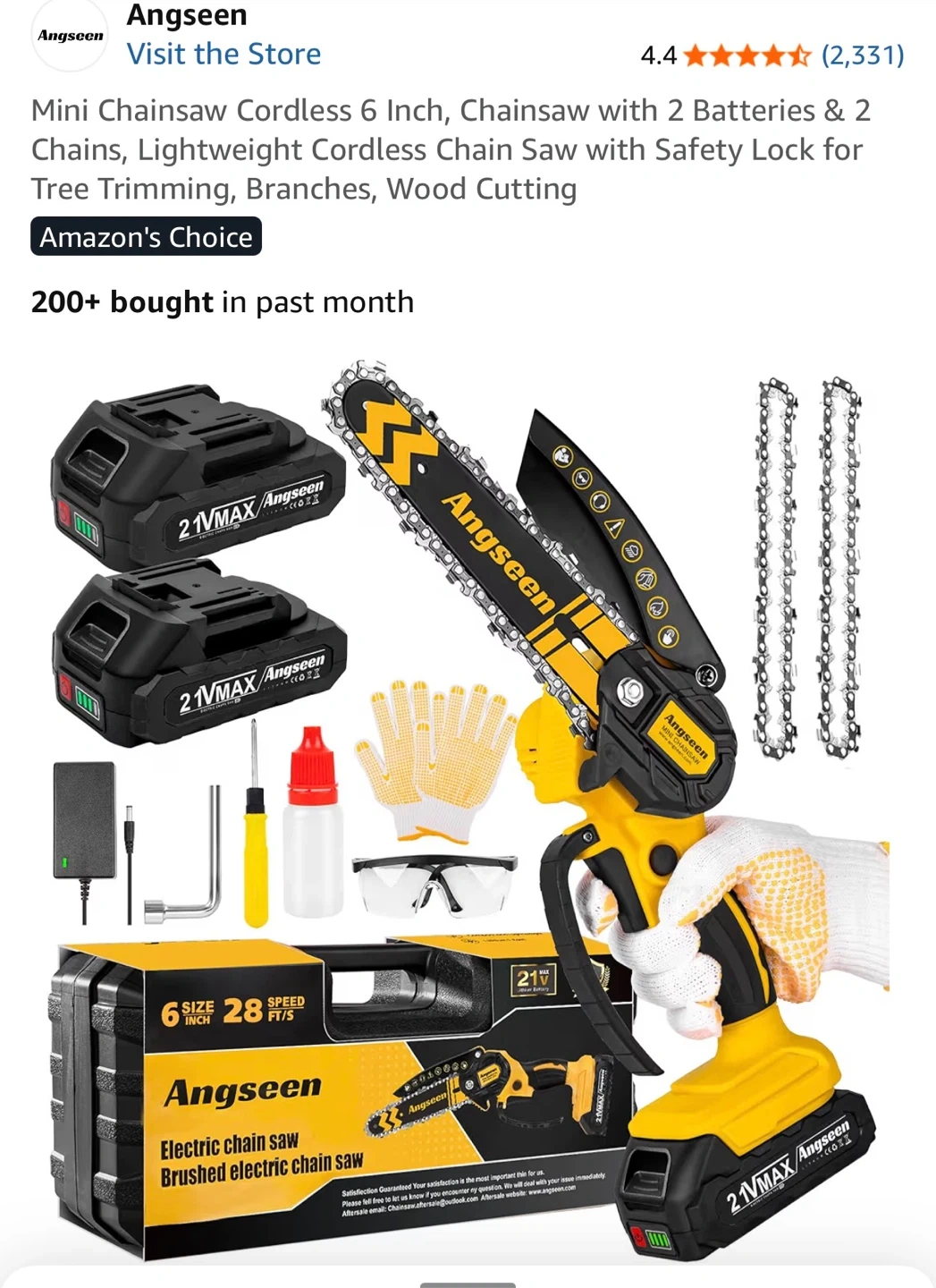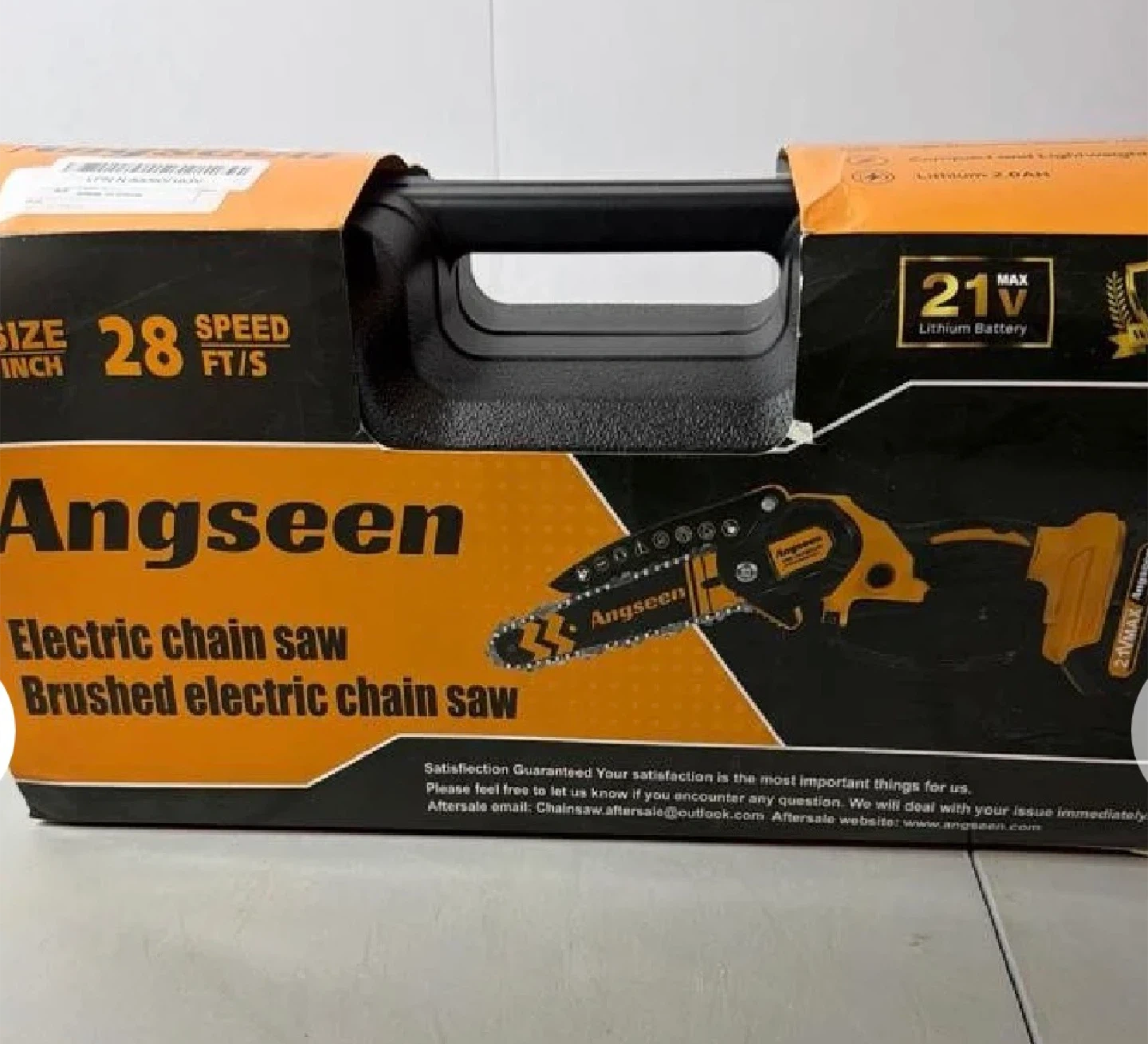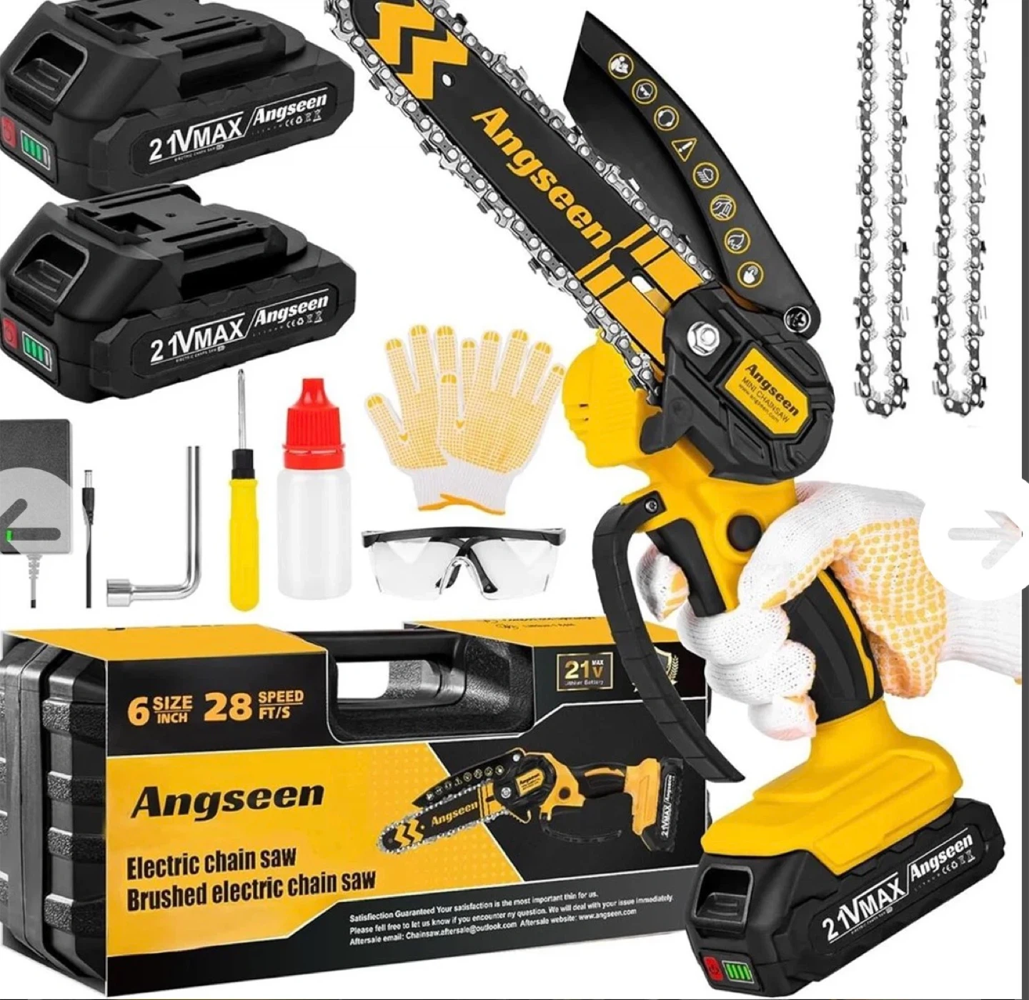 This Angseen electric chain saw comes with two 21V MAX lithium batteries and two chains. It's a brushed electric chainsaw with a 6-inch bar and a speed of 28 ft/s. This tool is useful for trimming branches and wood cutting.