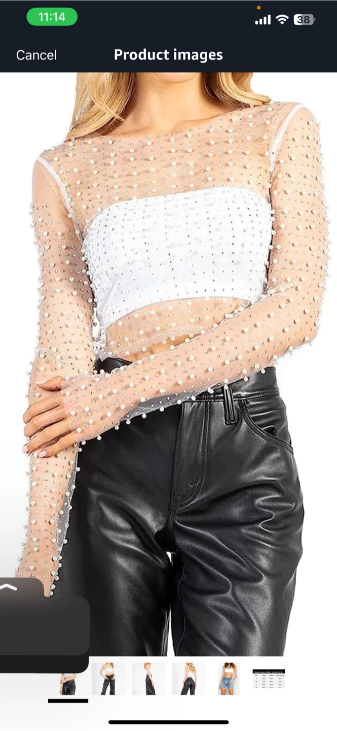 Selling a Naileksi sheer mesh crop top with pearl rhinestone detailing! This long-sleeve, slim-fit blouse shirt is perfect for clubwear or a night out. It's a unique and stylish piece to add to your wardrobe