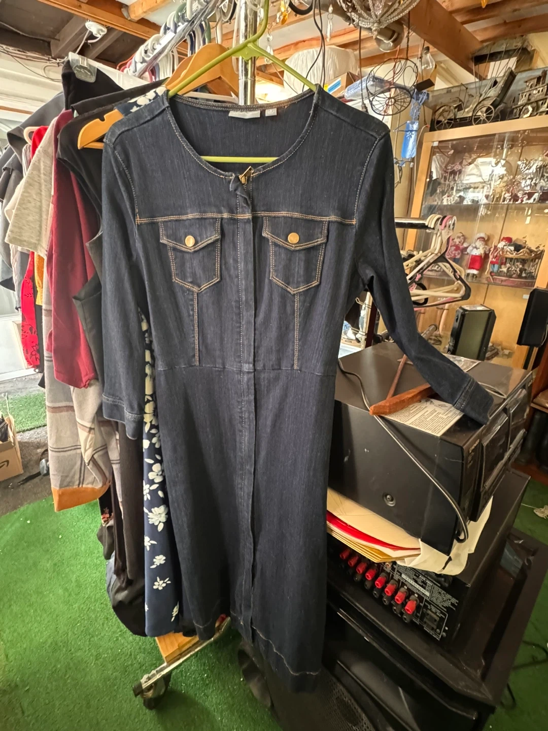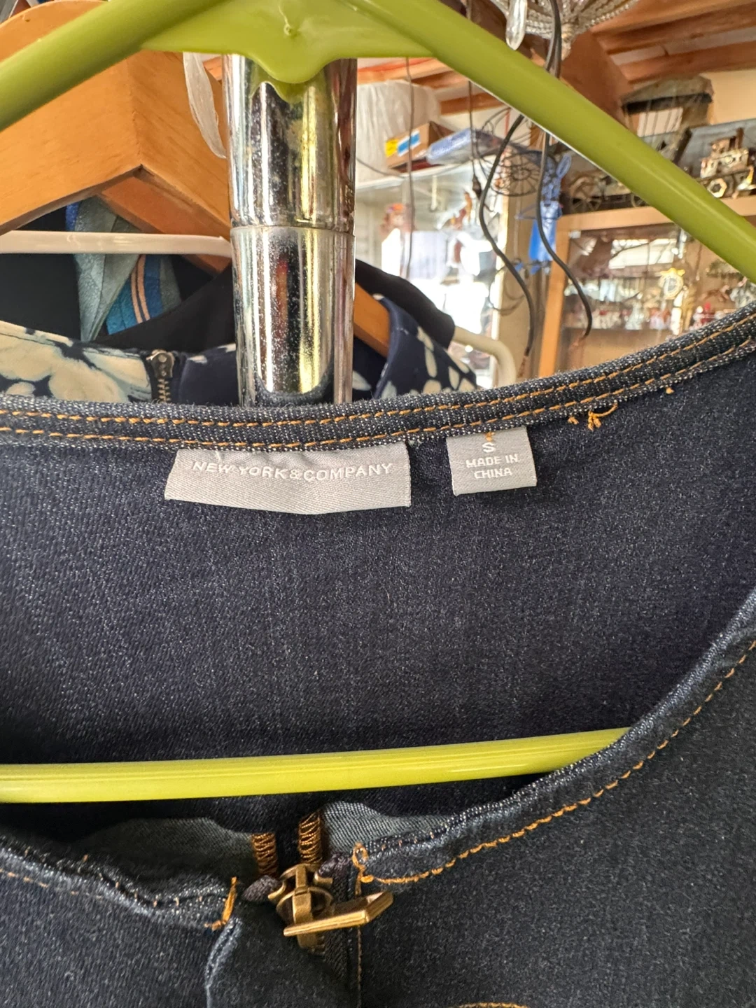 This dark wash denim dress is from New York & Company. It features a button-up front and two chest pockets. The dress is made in China.