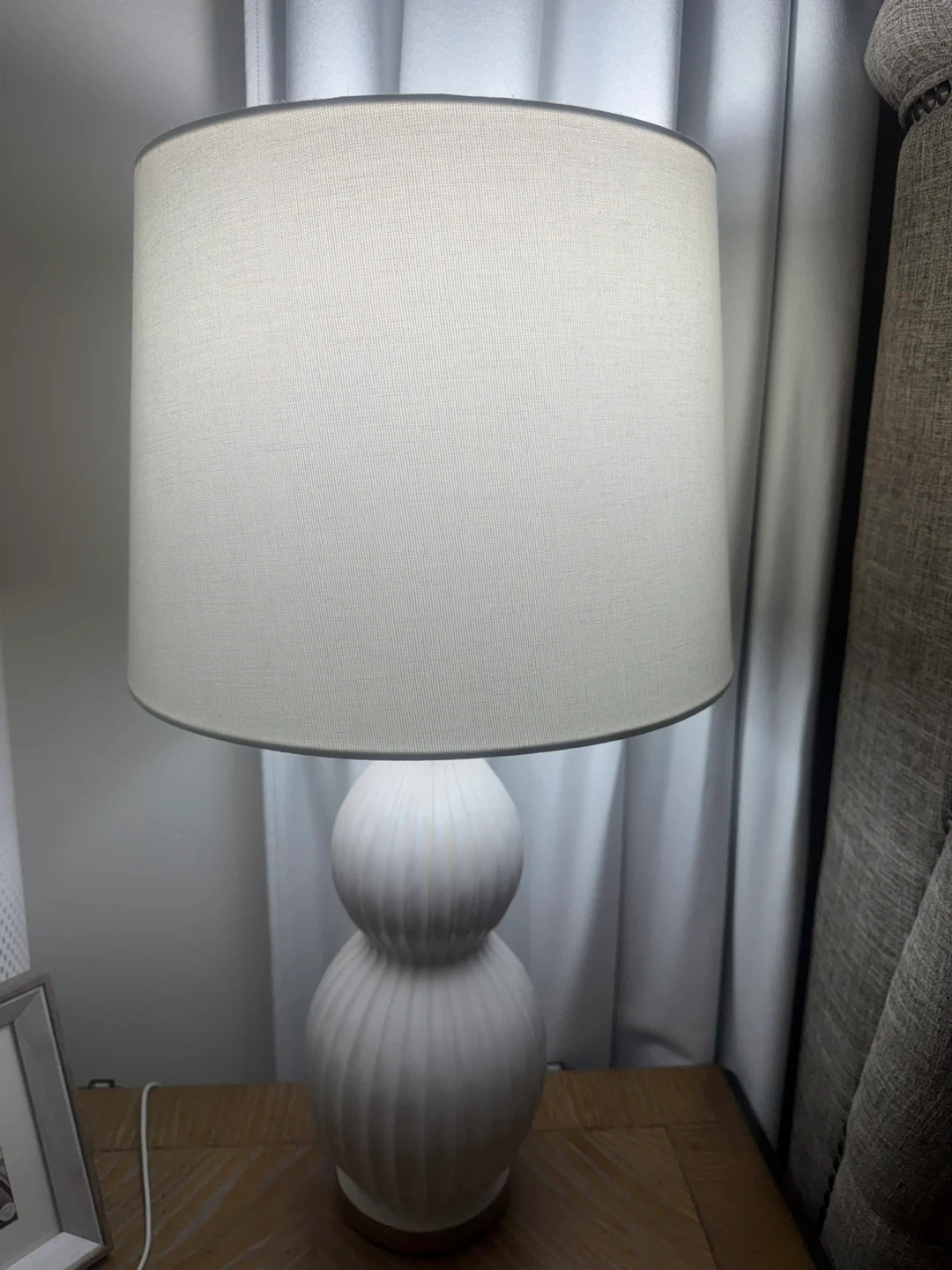 This white ceramic table lamp features a decorative, ribbed base. It's topped with a neutral drum shade. The lamp's design adds a touch of style to any room. It's a perfect accent for a bedside table or living room.