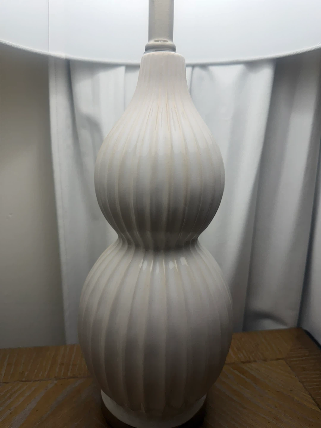 This white ceramic table lamp features a decorative, ribbed base. It's topped with a neutral drum shade. The lamp's design adds a touch of style to any room. It's a perfect accent for a bedside table or living room.