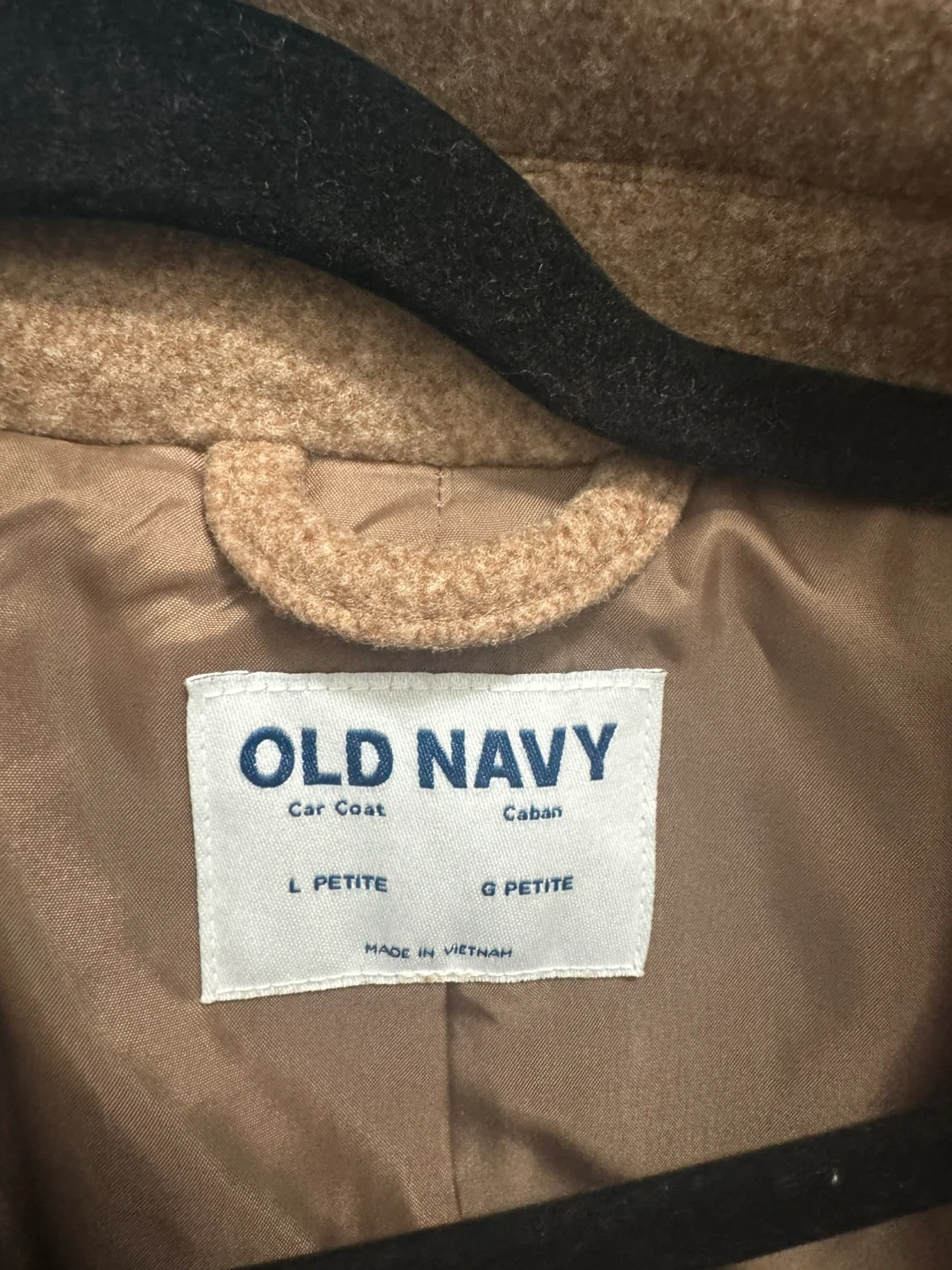 This Old Navy car coat is a size L Petite. It's a warm, stylish choice for cooler weather. Made in Vietnam.