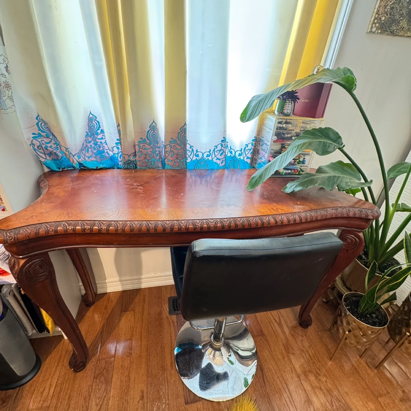 This is a beautiful wooden console table featuring ornate carvings on its legs and tabletop edge. It's a lovely piece that adds a touch of vintage elegance to any space. The rich wood finish is complemented by the intricate detailing.