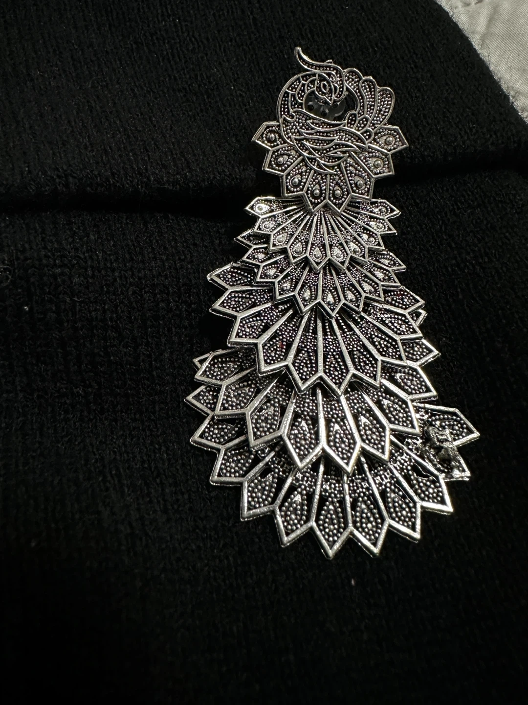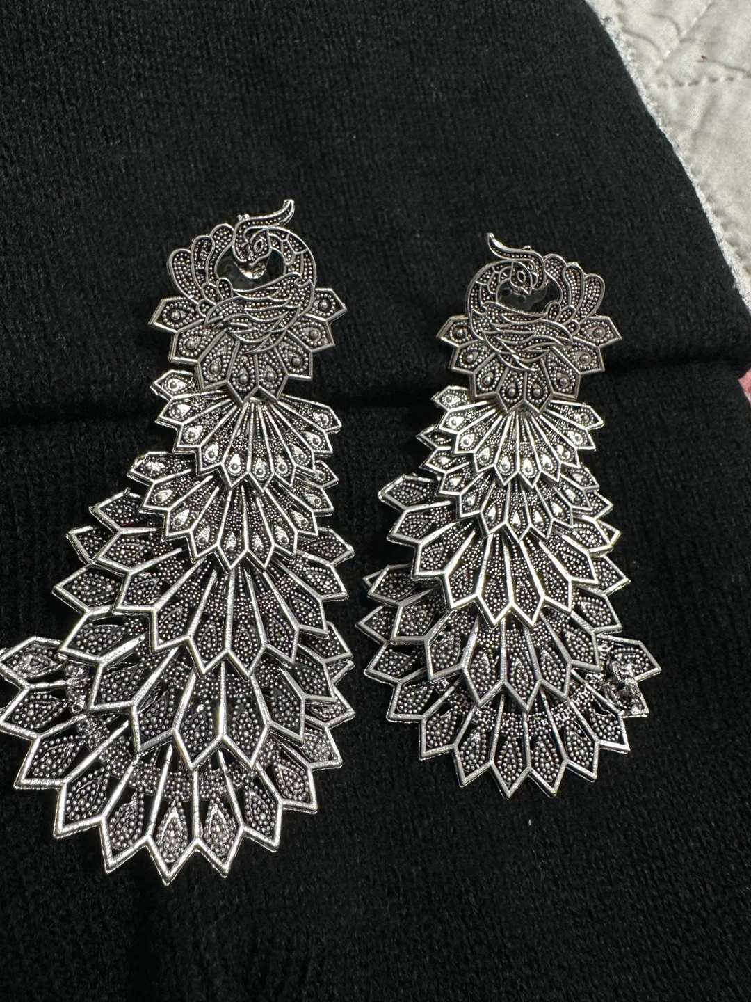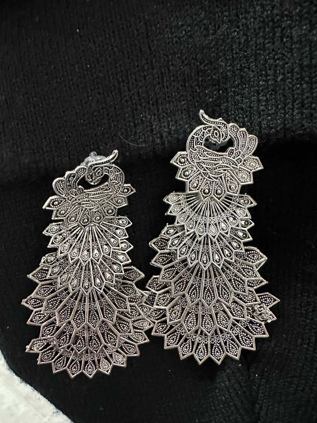 Gorgeous silver-toned dangle earrings designed with a peacock feather motif. These statement earrings are intricate and eye-catching. They're perfect for adding a touch of elegance to any outfit!