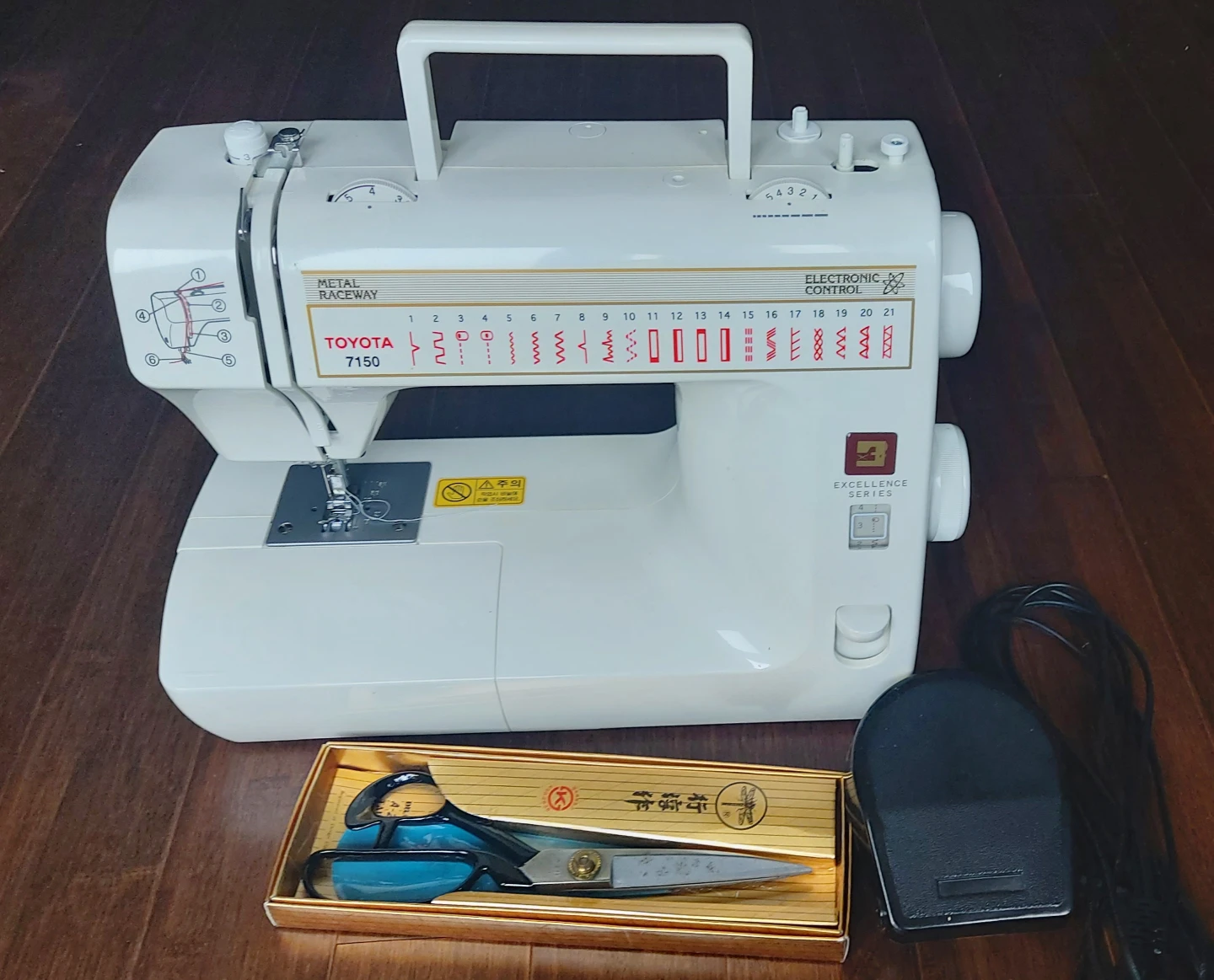 Excellent condition TOYOTA 7150 Electronic Control sewing machine. It's a great machine for various sewing projects. Includes foot pedal and a pair of scissors in a wooden case.