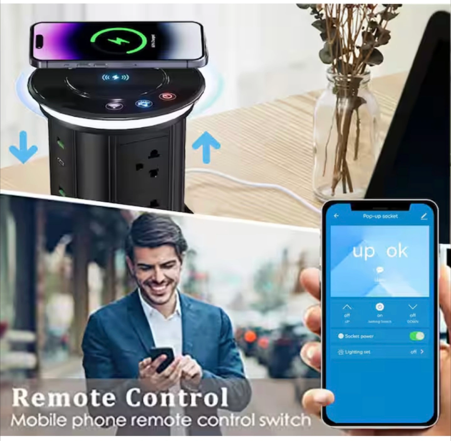 Selling a handy pop-up socket that comes with a wireless charger! It's perfect for a home office or any space where you need convenient power access. It even has remote control functionality, and is waterproof!