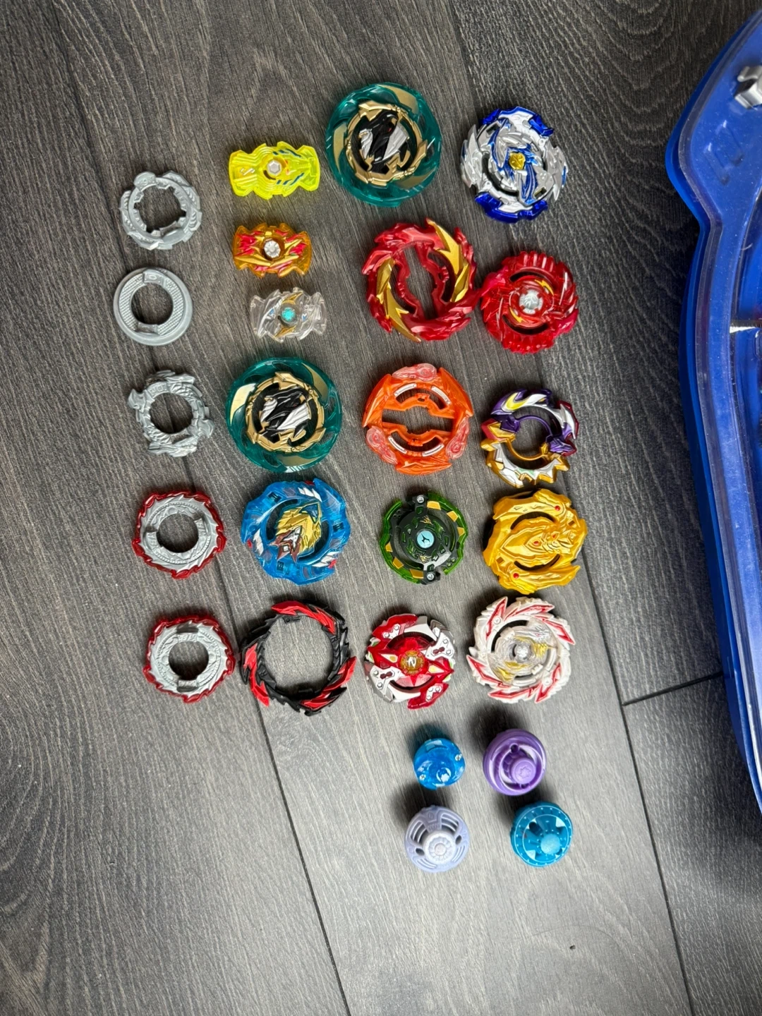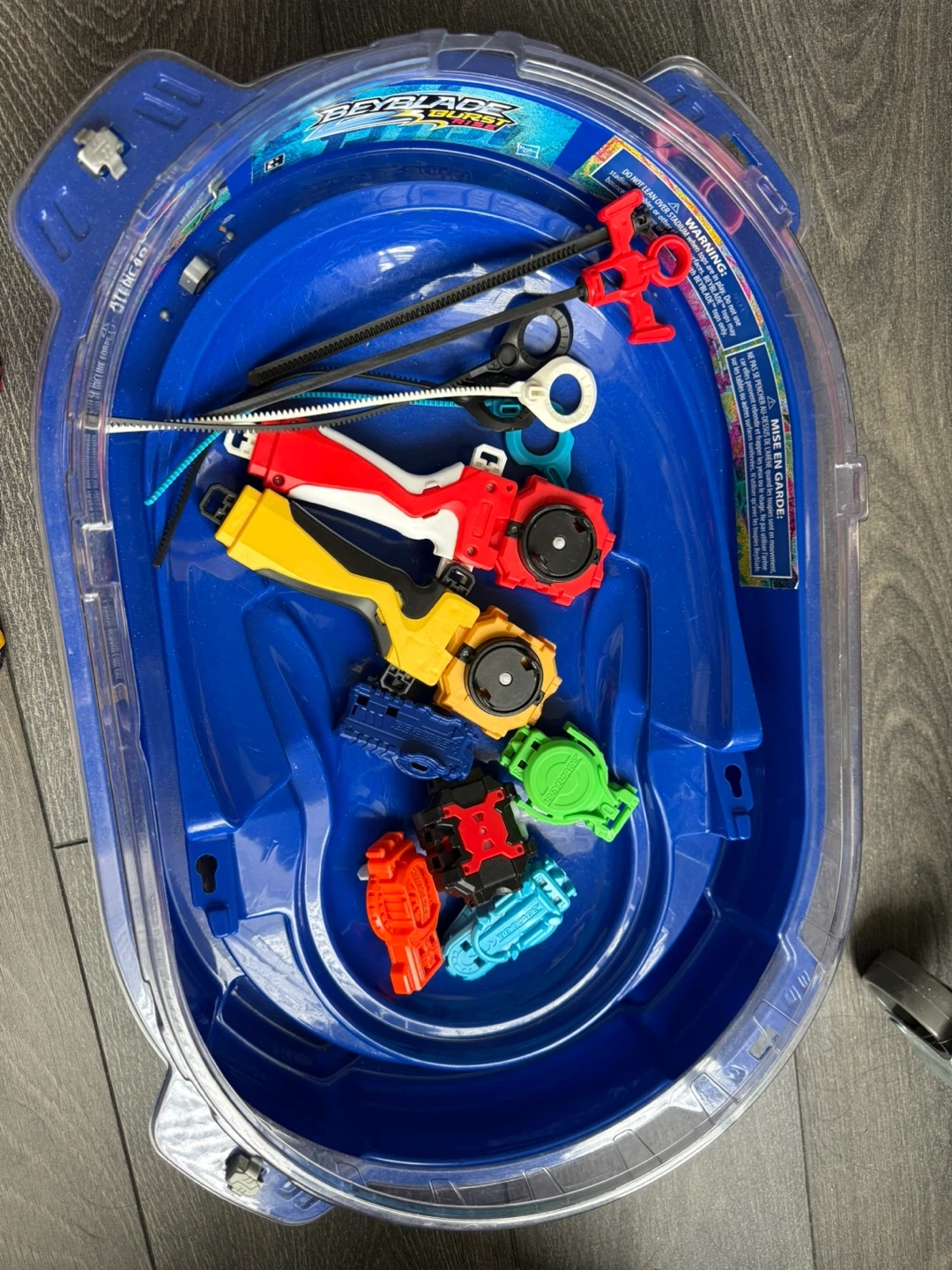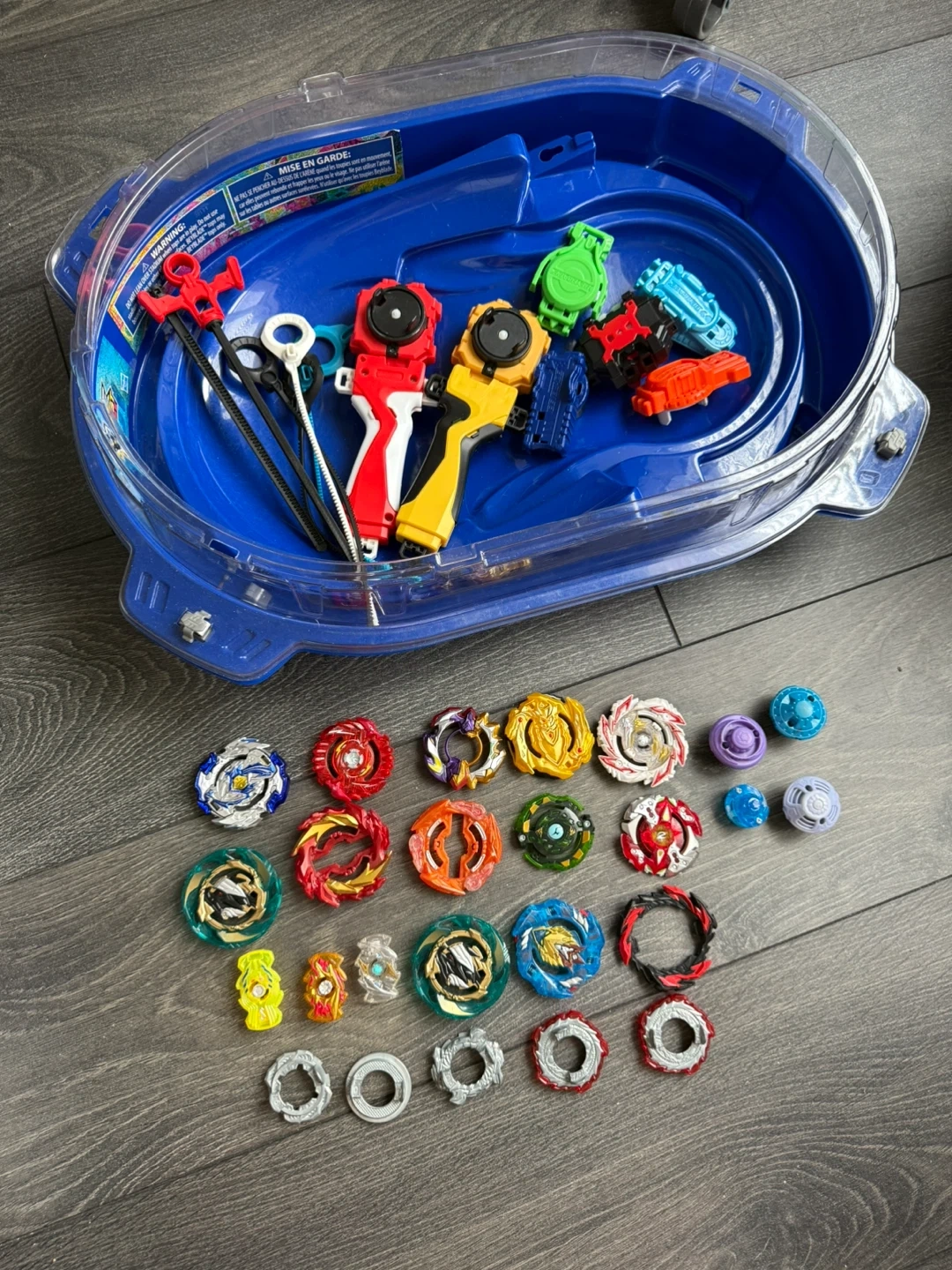 Beyblade Burst Rise Hypersphere Vortex Climb Beystadium with collection of various Beyblade spinning tops, launchers with rip cords.