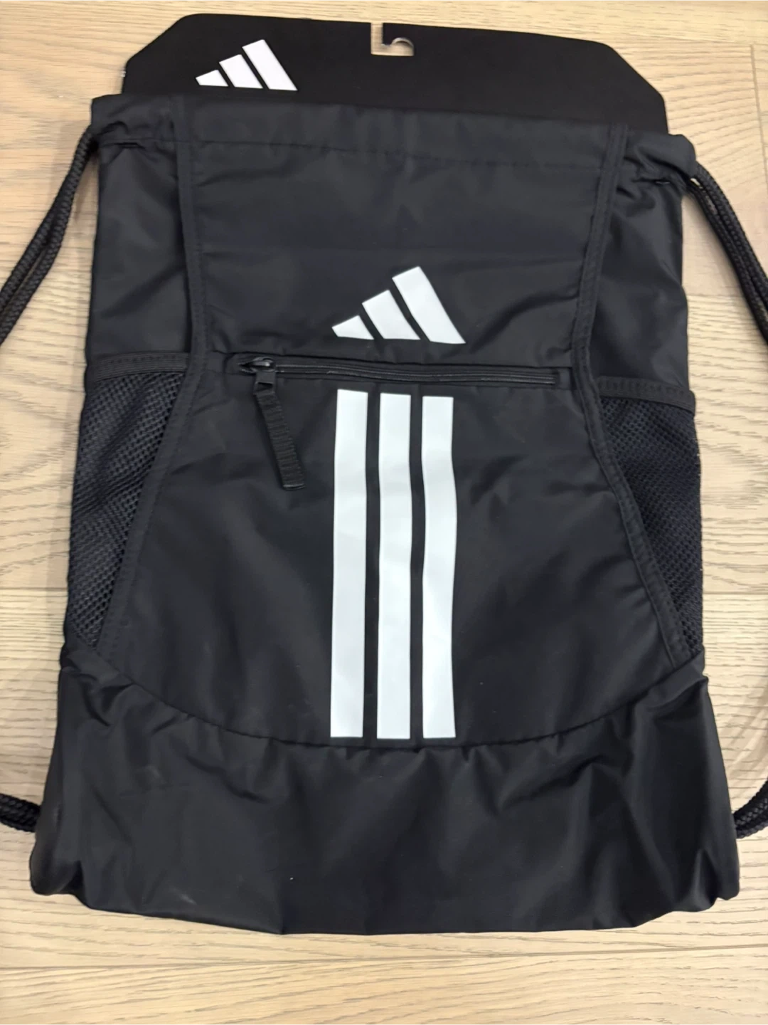 Selling a black Adidas drawstring backpack! It features the classic three-stripe design, a zippered front pocket and mesh slip-pockets for water bottles. Perfect for carrying your gym clothes or everyday essentials.