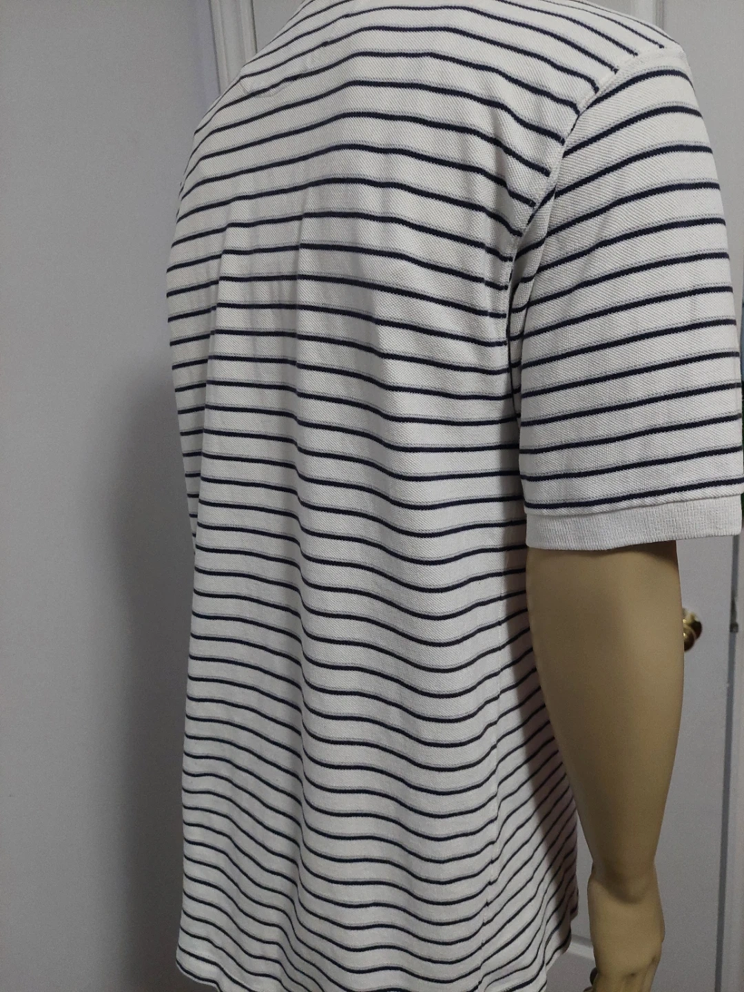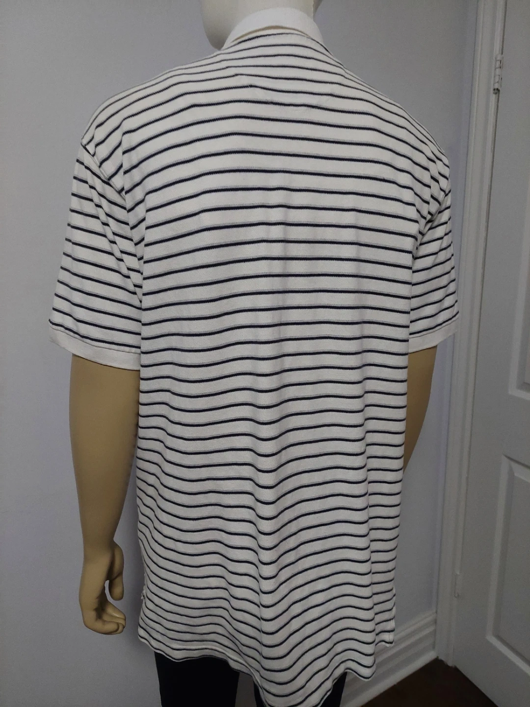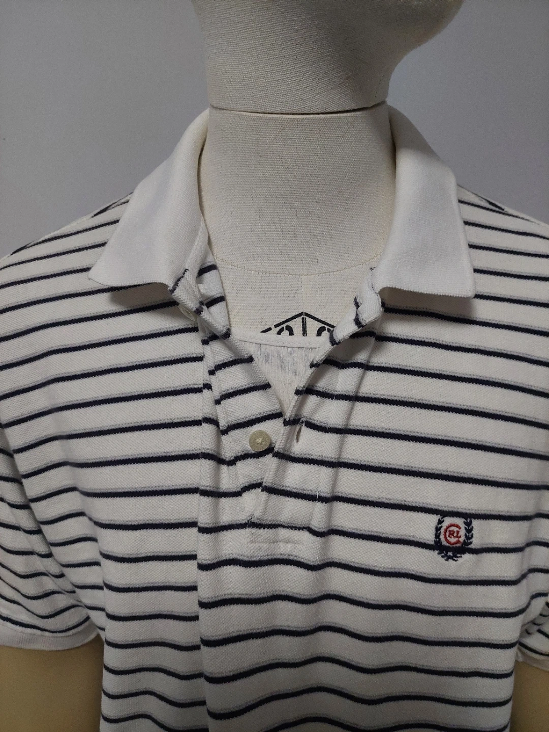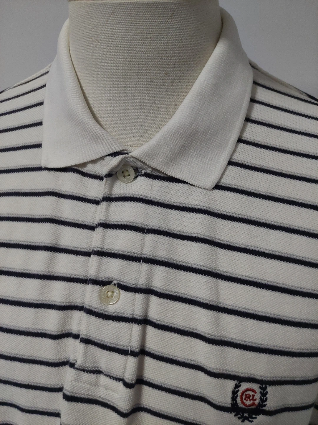 Chaps Ralph Lauren polo shirt with a white and navy stripe pattern. Add a classic, preppy touch to your wardrobe with this authentic vintage Chaps by Ralph Lauren polo shirt. Featuring a timeless horizontal striped pattern and the iconic embroidered Chaps crest on the chest, this shirt offers a perfect retro 90s aesthetic.