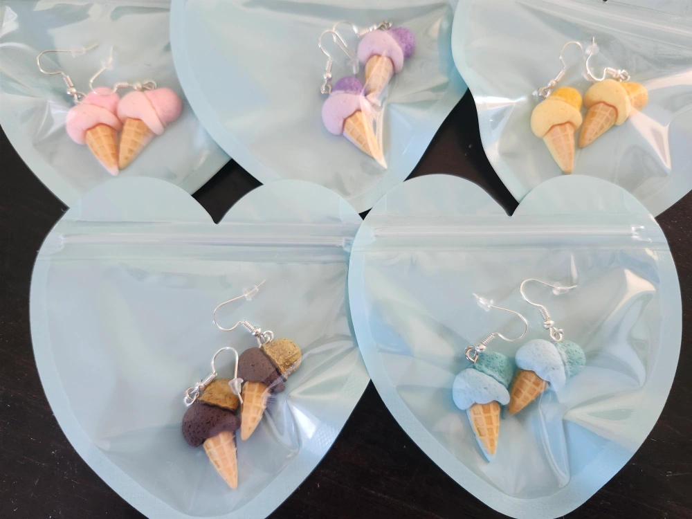 65Adorable ice cream cone dangle earrings! These earrings are handmade and come in a variety of fun colours. Perfect for adding a sweet touch to any outfit!