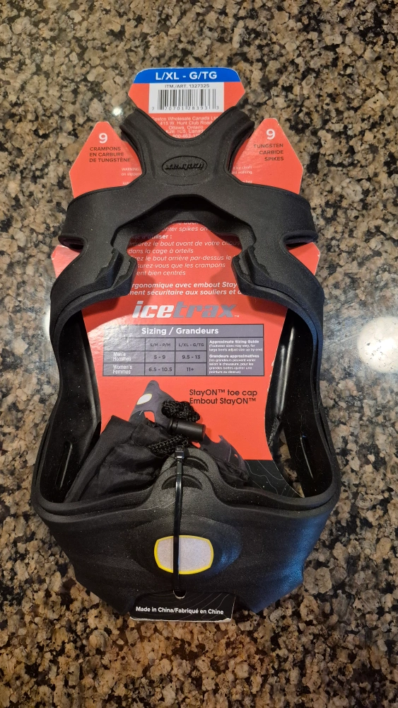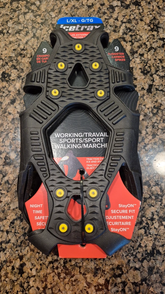 15Selling a pair of Ice Trex crampons in size L/XL. They're designed for working, sports, and walking on ice and snow. These crampons feature StayON secure fit adjustment and provide night time safety. They have 9 tungsten carbide spikes for traction. Great for winter walks!