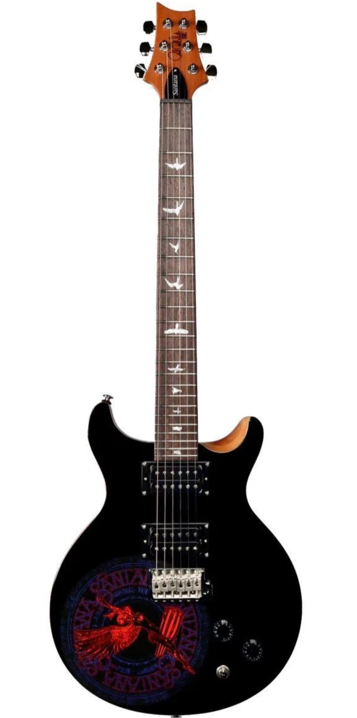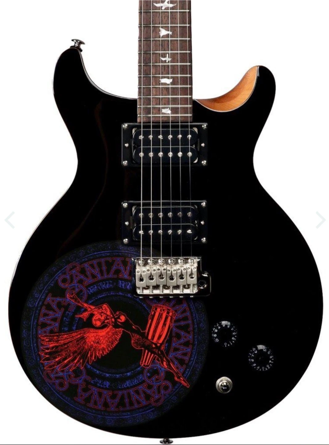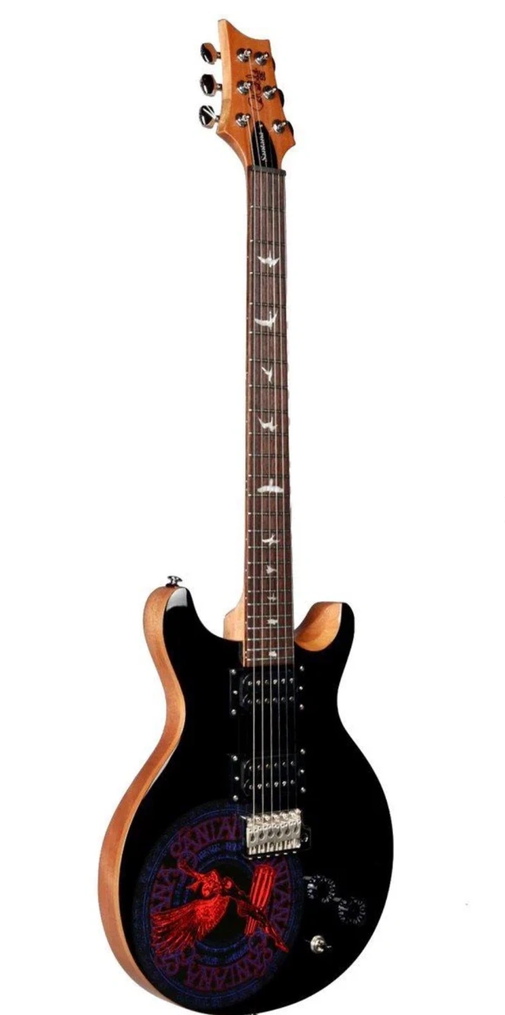 This is a PRS SE Carlos Santana electric guitar. It features a black finish with a custom graphic. The back of the guitar is natural wood.
