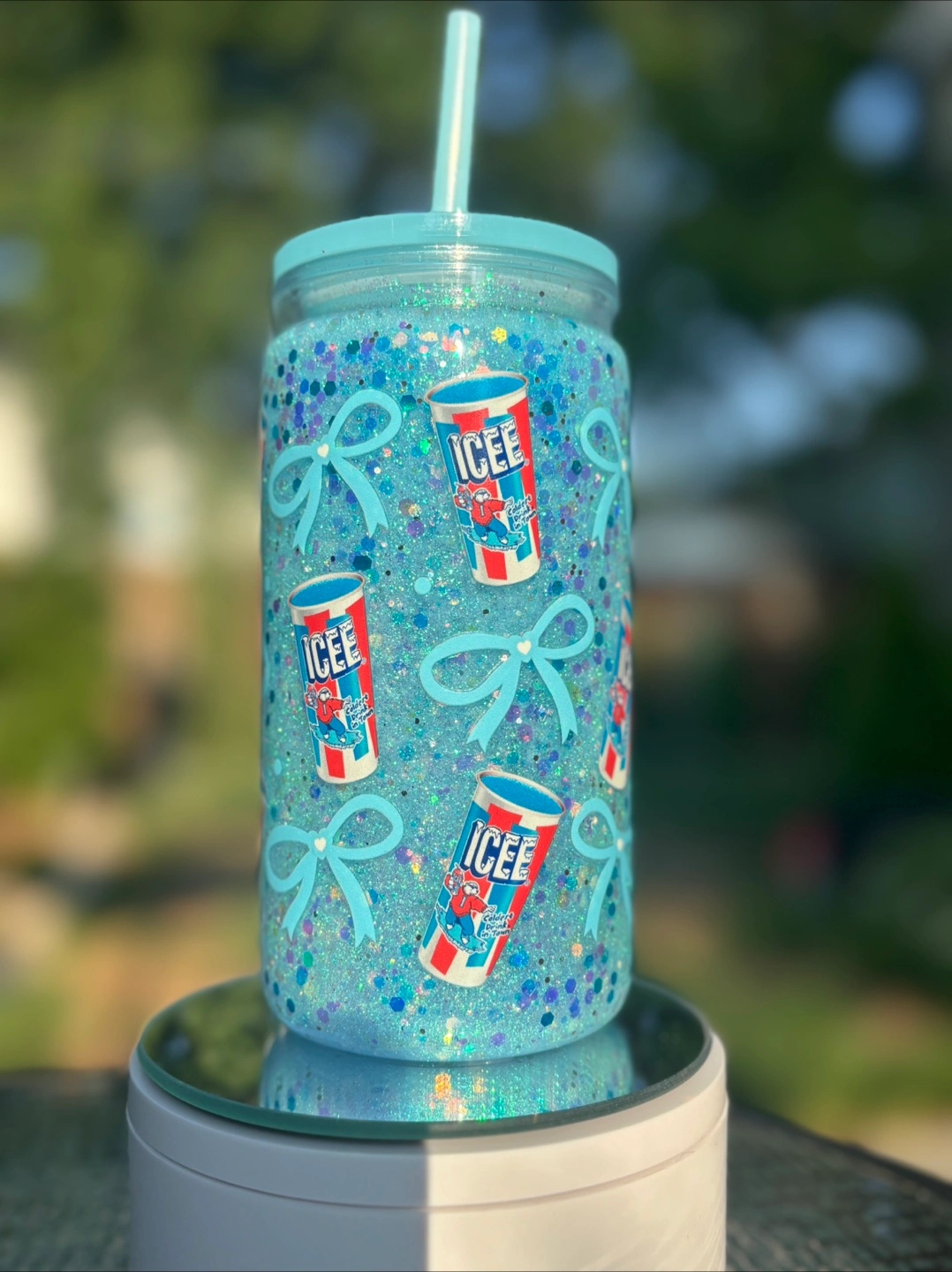 Check out this adorable ICEE themed tumbler! It's covered in blue glitter and has cute little bows and ICEE logos all over it. Comes with a matching straw, perfect for keeping your drinks cold and showing off your love for ICEE
