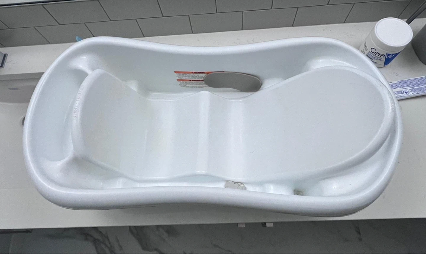 White Fisher-Price baby bath tub with infant support. It has a contoured shape for baby's comfort. This tub is suitable for newborns and up. Perfect for bath time!