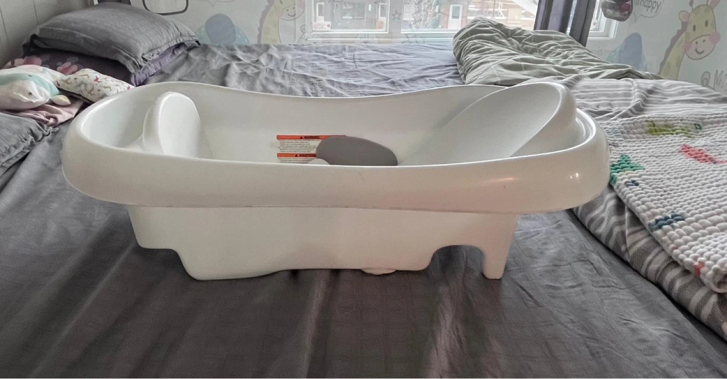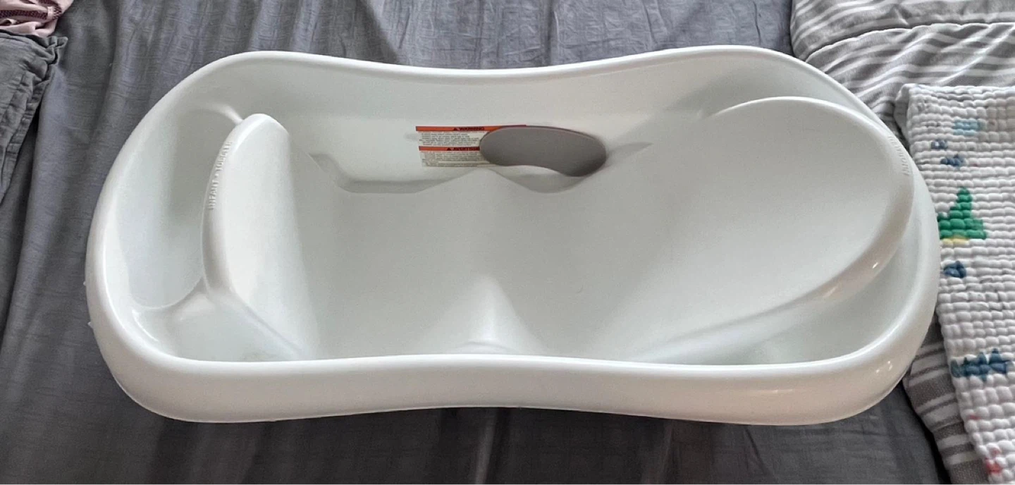 White Fisher-Price baby bath tub with infant support. It has a contoured shape for baby's comfort. This tub is suitable for newborns and up. Perfect for bath time!