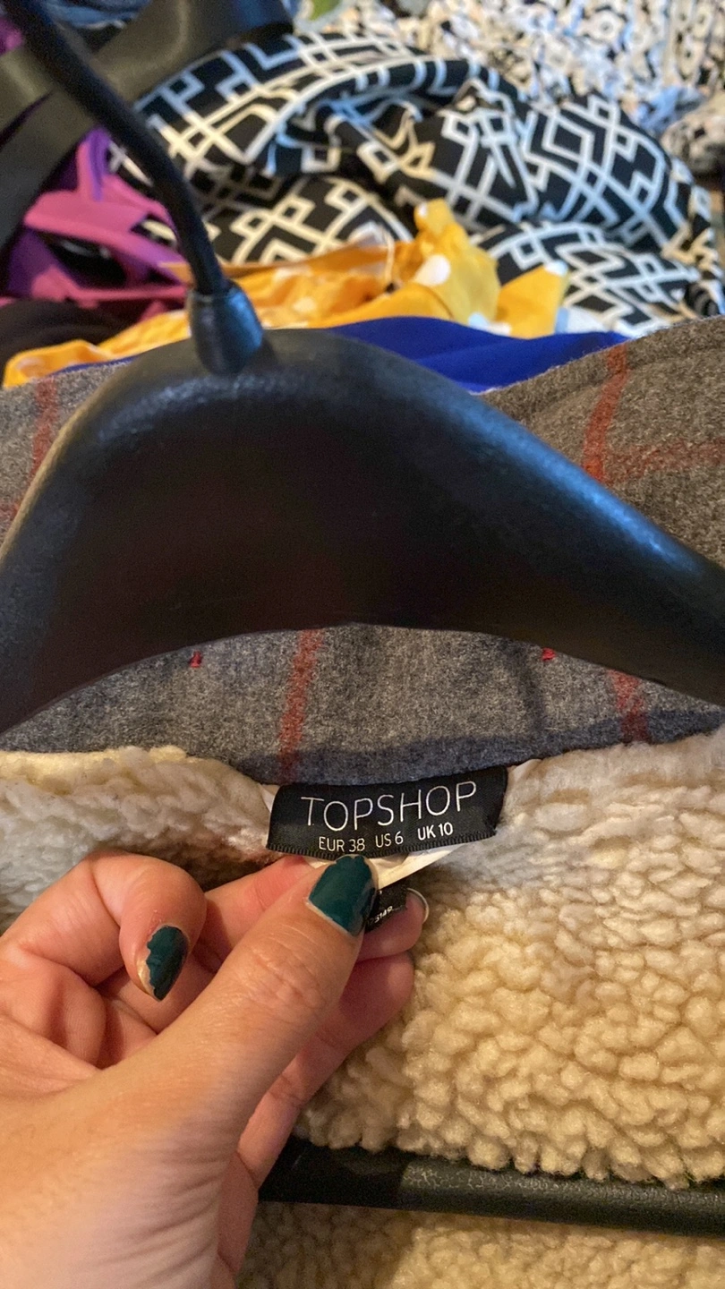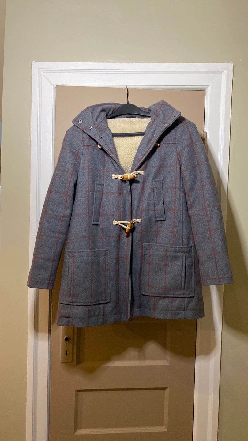 Topshop plaid duffle coat. Size 6. Grey with red plaid stripes.