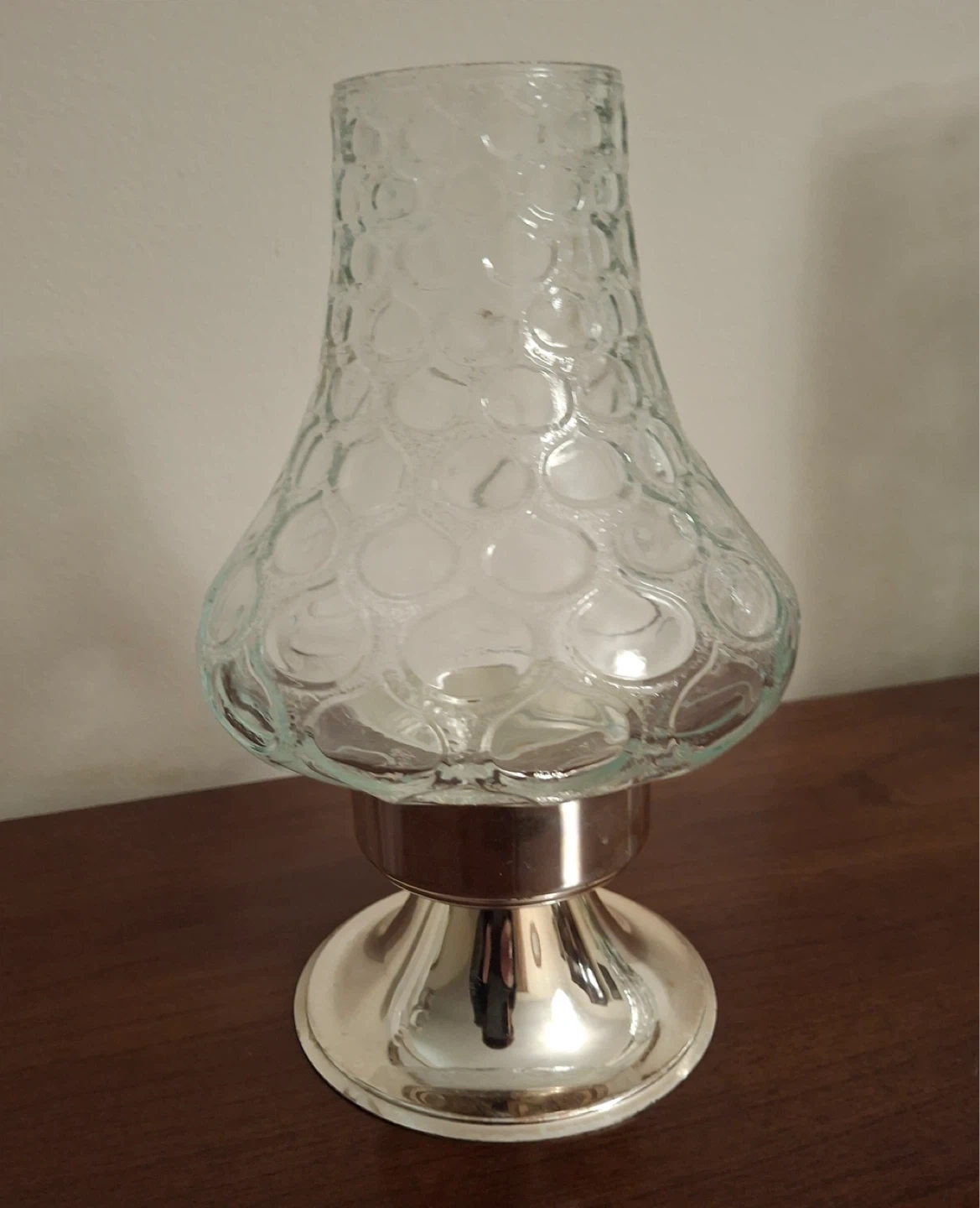 Heavy glass hurricane candle holder. Detail/texture on the glass. Base is silver plated and tarnish resistant. Made in Germany. 8” high, 4.5” at its widest. Quist brand, made in Germany.