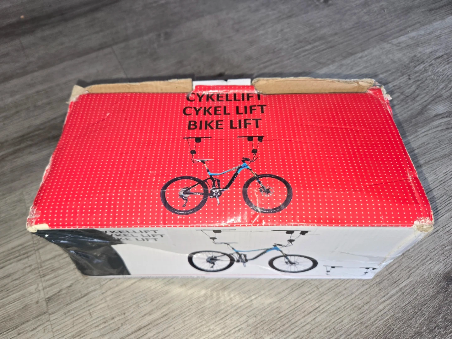 This CYKELLIFT bike lift is designed for ceiling mounting. It allows for convenient storage of your bicycle. It's made of durable metal components.