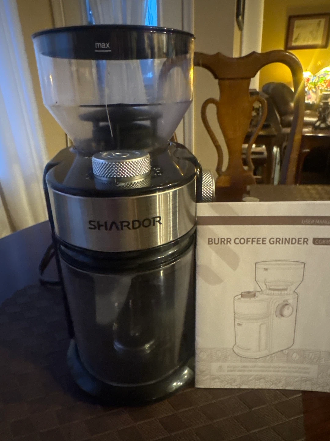 This is a SHARDOR burr coffee grinder. It's a compact appliance for grinding coffee beans. Includes the user manual. Like New- Used 6 times