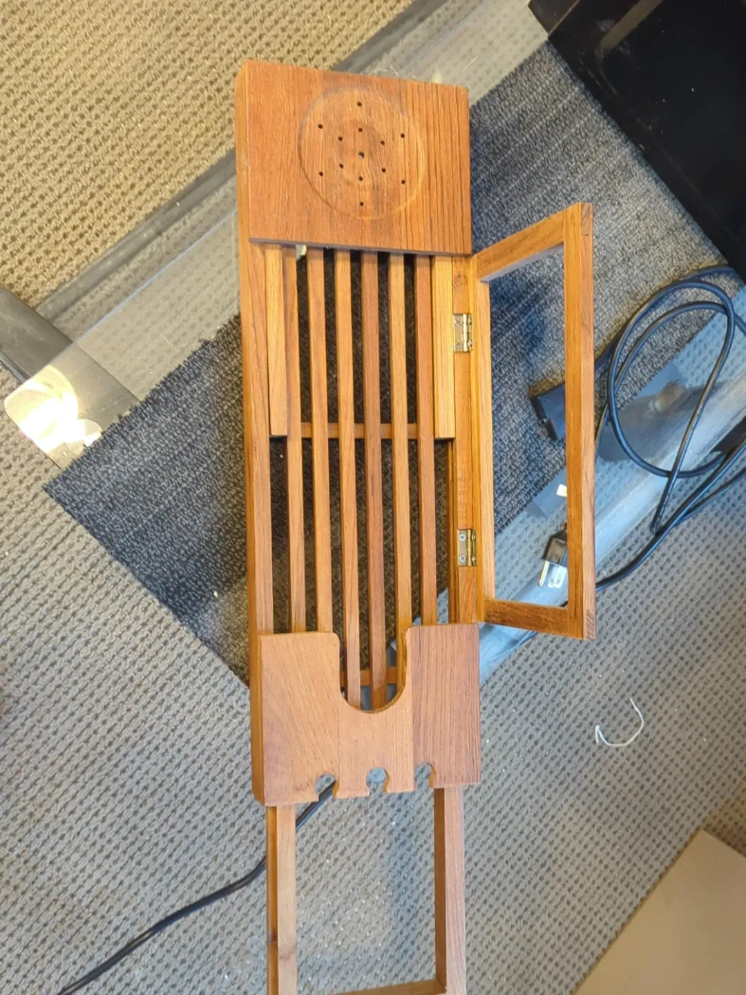 Wooden bath caddy. It has a slatted design and some circular holes on the top panel. Perfect for holding bath essentials and relaxing in the tub!