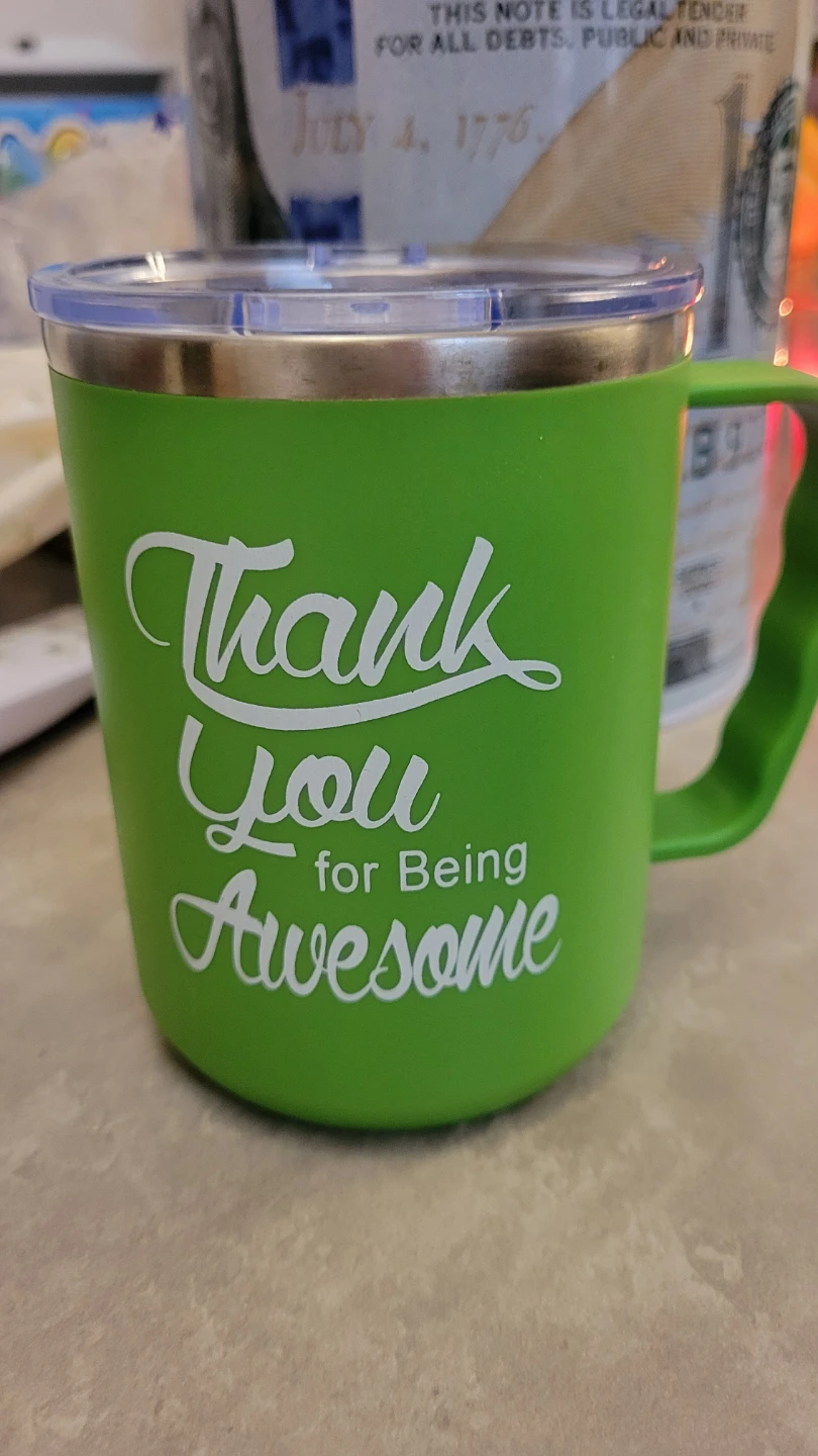 I'm selling a green travel mug with the words "Thank You for Being Awesome" printed on it. It has a clear, sliding lid to prevent spills. Perfect for keeping your drinks hot or cold on the go!
