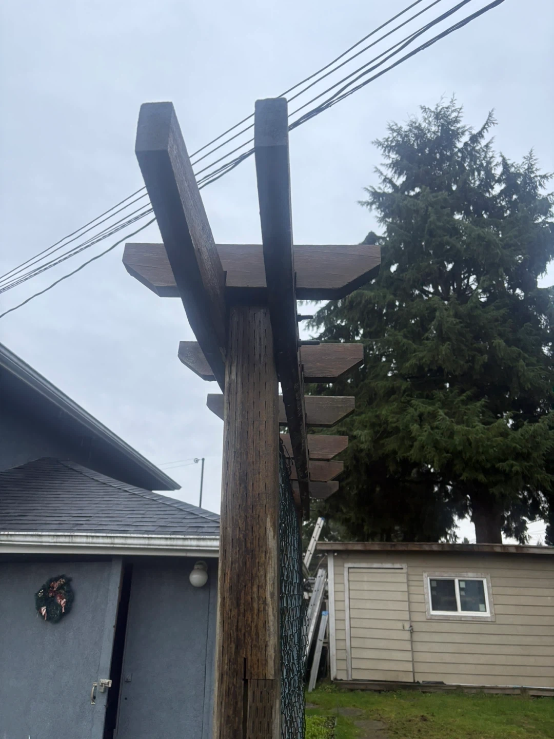 This is a wooden pergola frame, likely for a garden or walkway. It's constructed from weathered wood posts and beams. Included is a roll of chain link fencing that can be attached as a screen or for climbing plants. This would be great for adding some structure and privacy to your outdoor space.