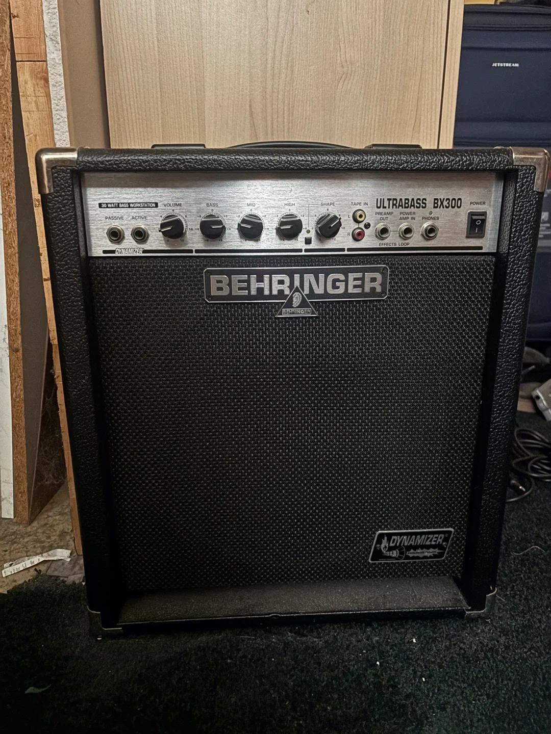 This is a Behringer Ultrabass BX300 bass amplifier. It's a 30-watt workstation. It has controls for volume, bass, mid, and high frequencies, plus a shape switch. Includes tape in and headphone jacks. It also has an effects loop.