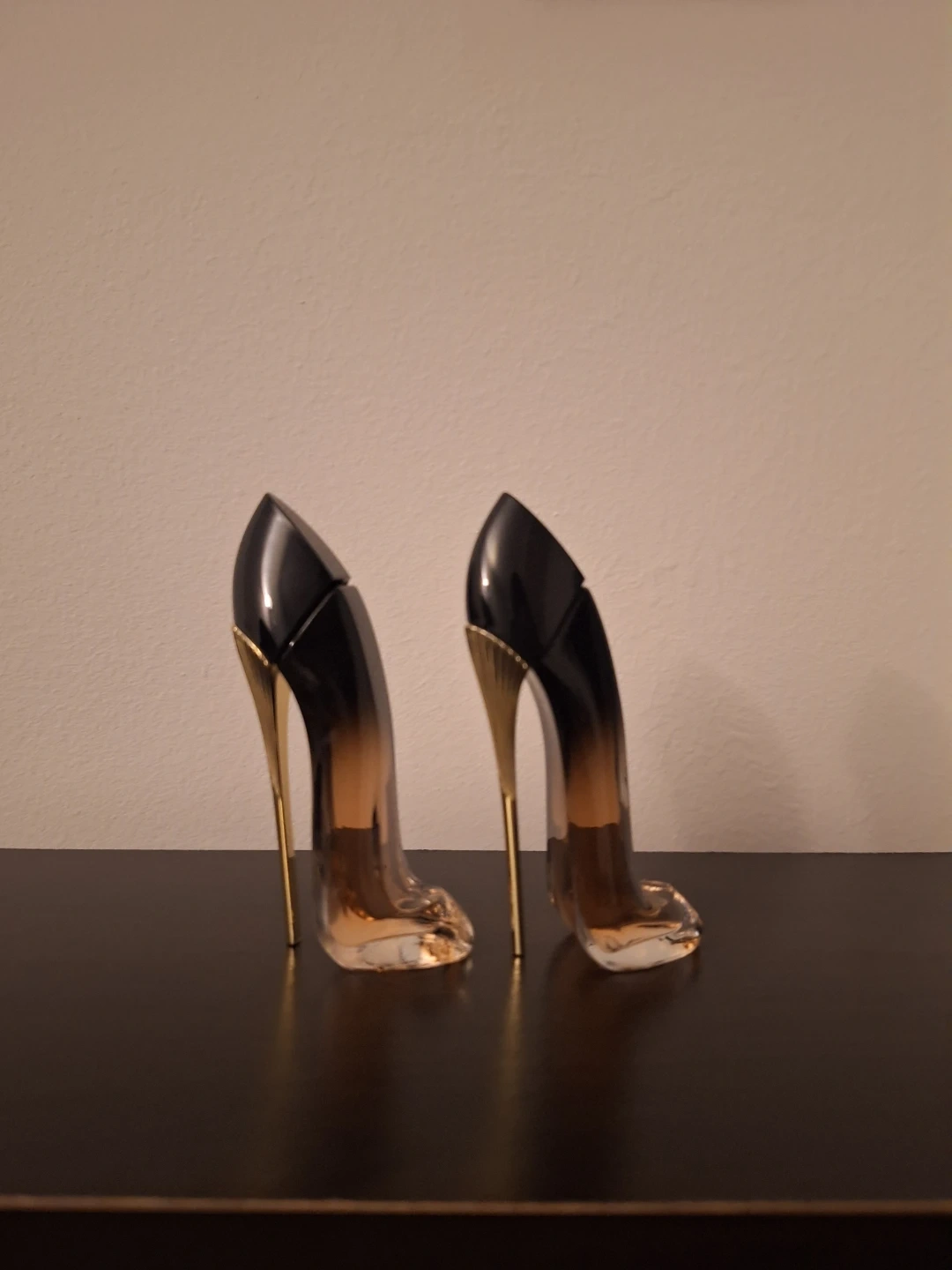 2 travel size bottles of Carolina Herrera Good Girl Blush Elixir Eau Parfum. The fragrance comes in a distinctive stiletto heel-shaped bottle.