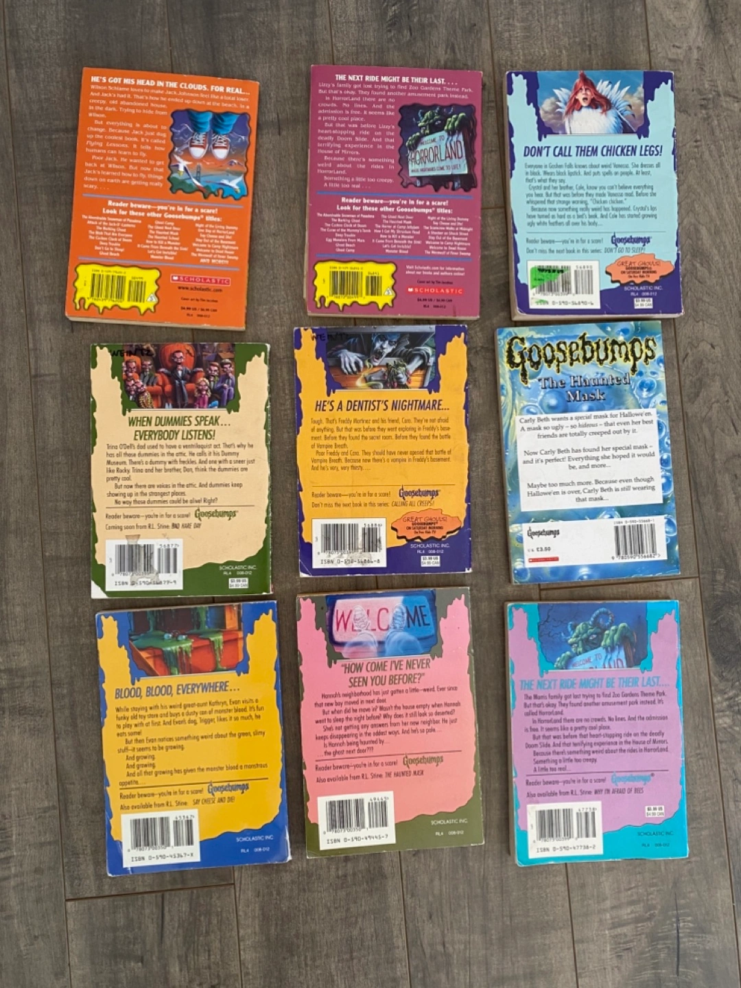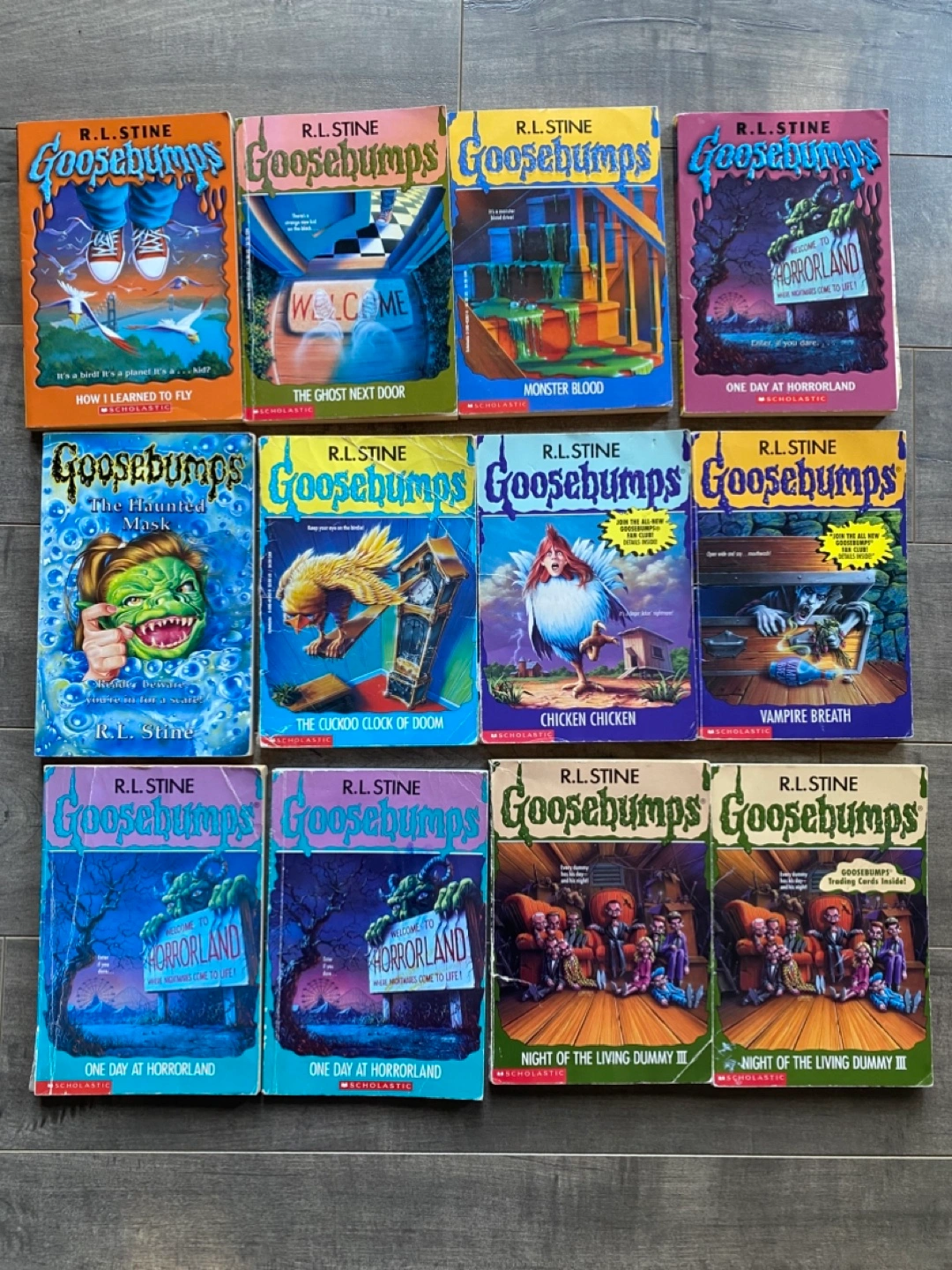 Nine Goosebumps books by R.L. Stine. Titles include How I Learned to Fly, One Day at HorrorLand, Chicken Chicken, Night of the Living Dummy III, Vampire Breath, The Haunted Mask, Monster Blood, The Ghost Next Door, and another copy of One Day at HorrorLand. These classic horror novels are perfect for young readers who enjoy a good scare!