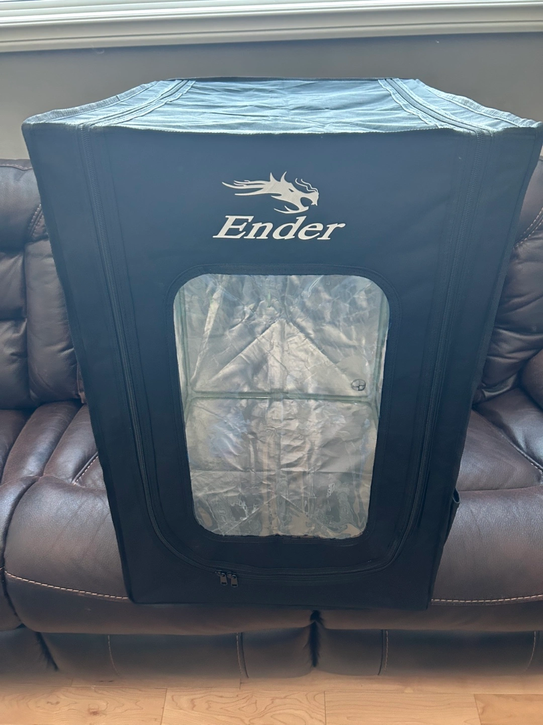 Black 3D Printer fireproof Enclosure with a clear window. Has a zipper on the front and a handle on the side. 720mm tall,480mm wide, 600mm deep.