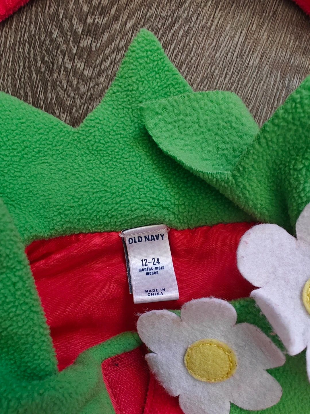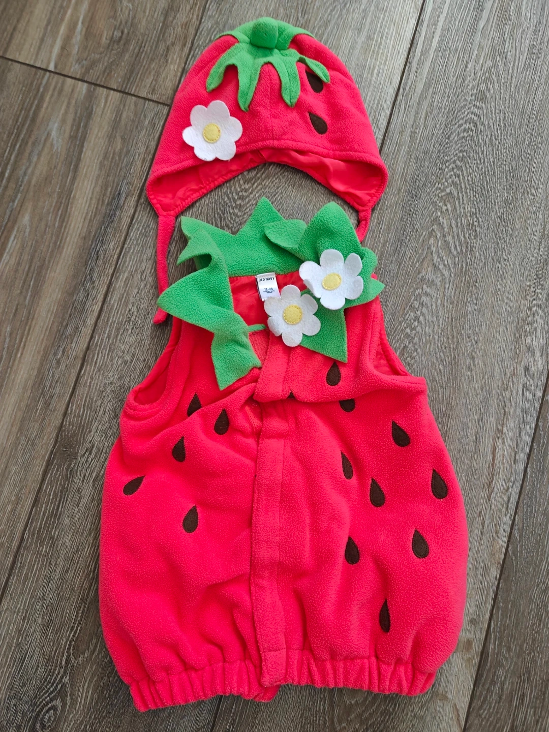 This Old Navy strawberry costume set includes a hat and vest for babies aged 12-24 months. It's made of soft fleece material and features cute flower and seed details. Perfect for themed photoshoots at events or daycare!