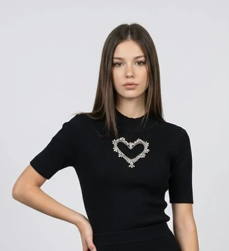 Black short-sleeve ribbed knit top. It features a sparkling heart embellishment with rhinestones at the neckline. Great for adding a touch of glamour to your outfit!